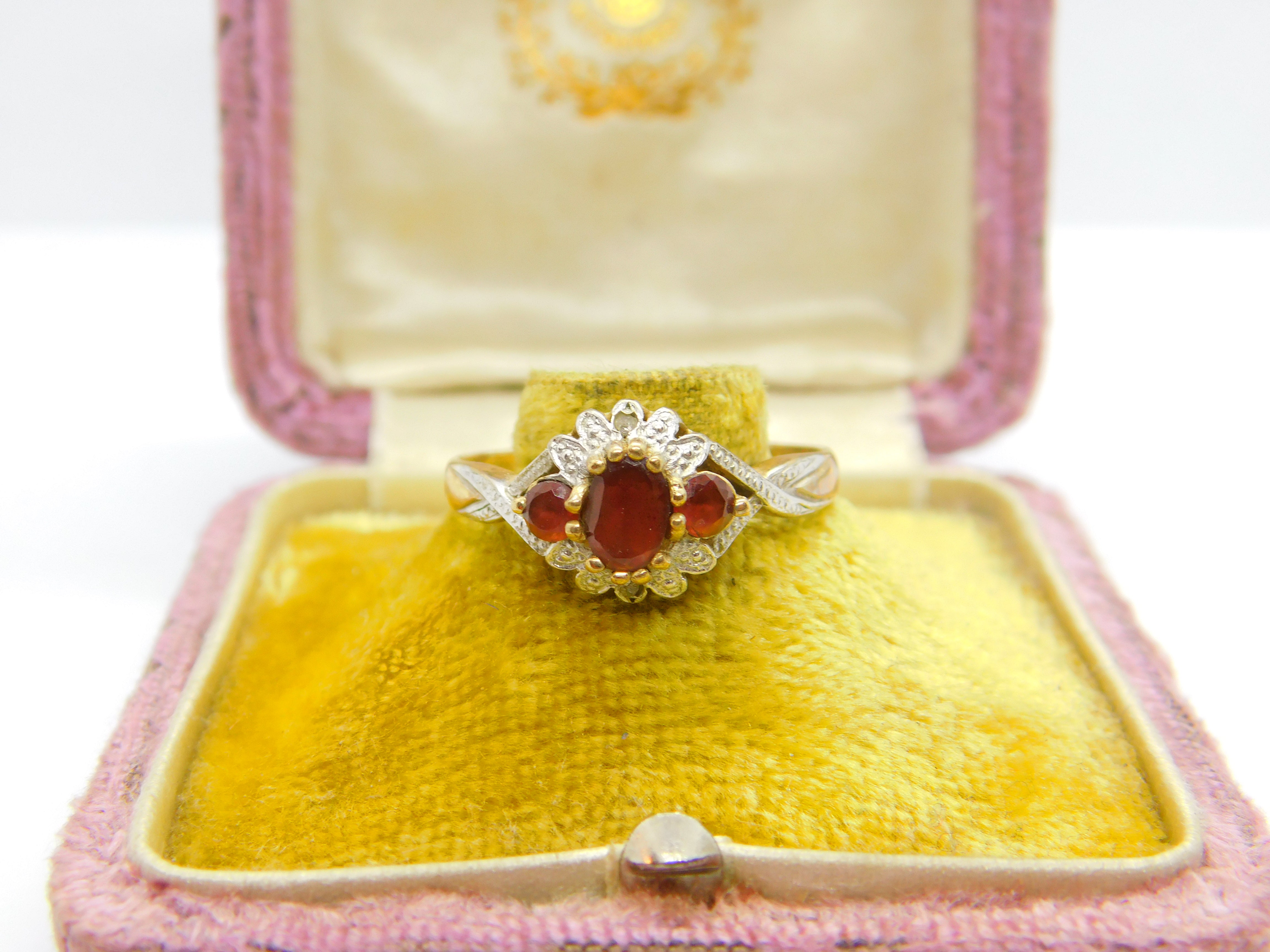 9ct Yellow Gold, Garnet & Diamond Floral Band Ring Vintage c1990 Birmingham