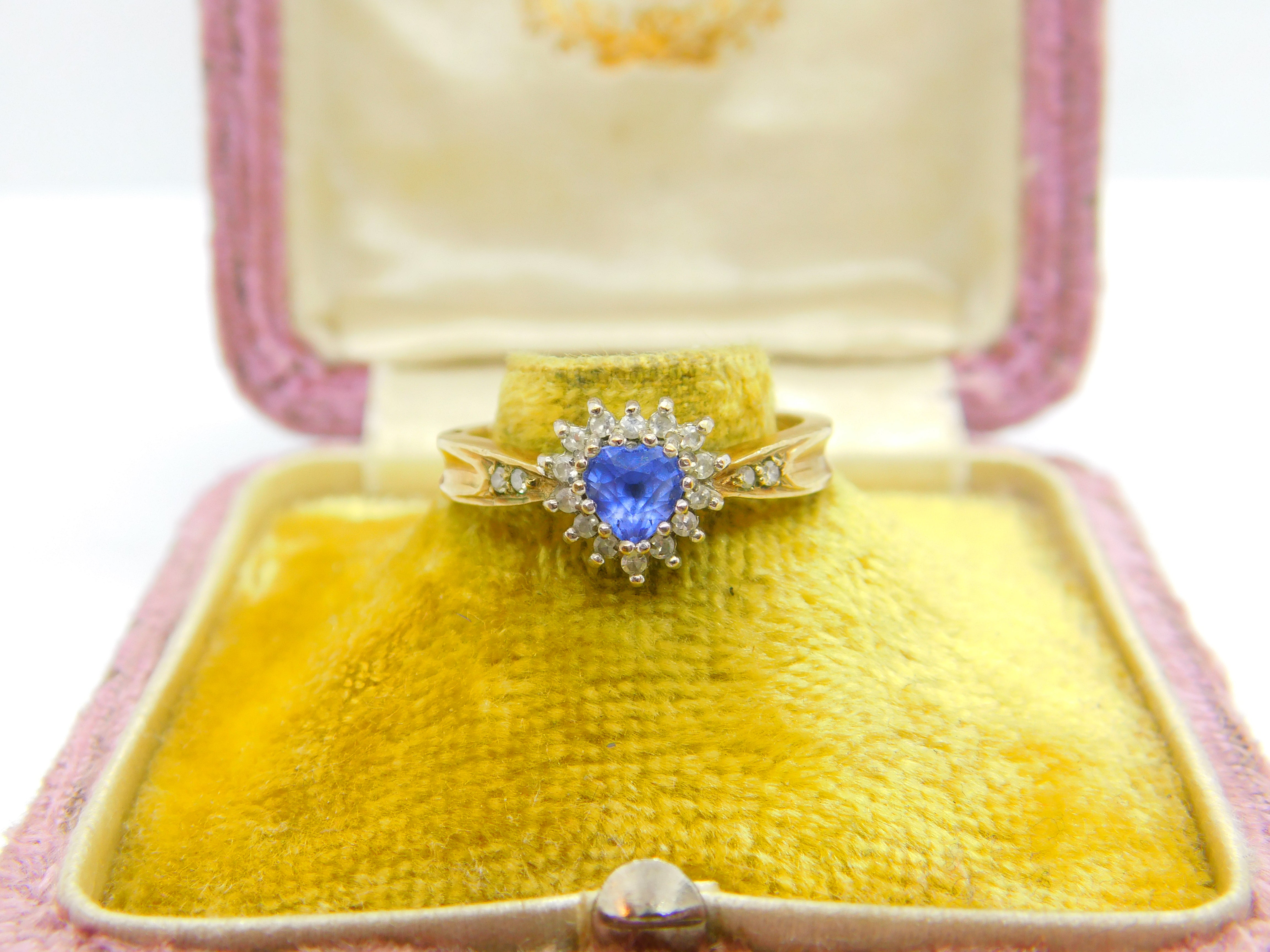 9ct Yellow Gold Heart Shaped Sapphire & Diamond Band Ring Vintage c1980