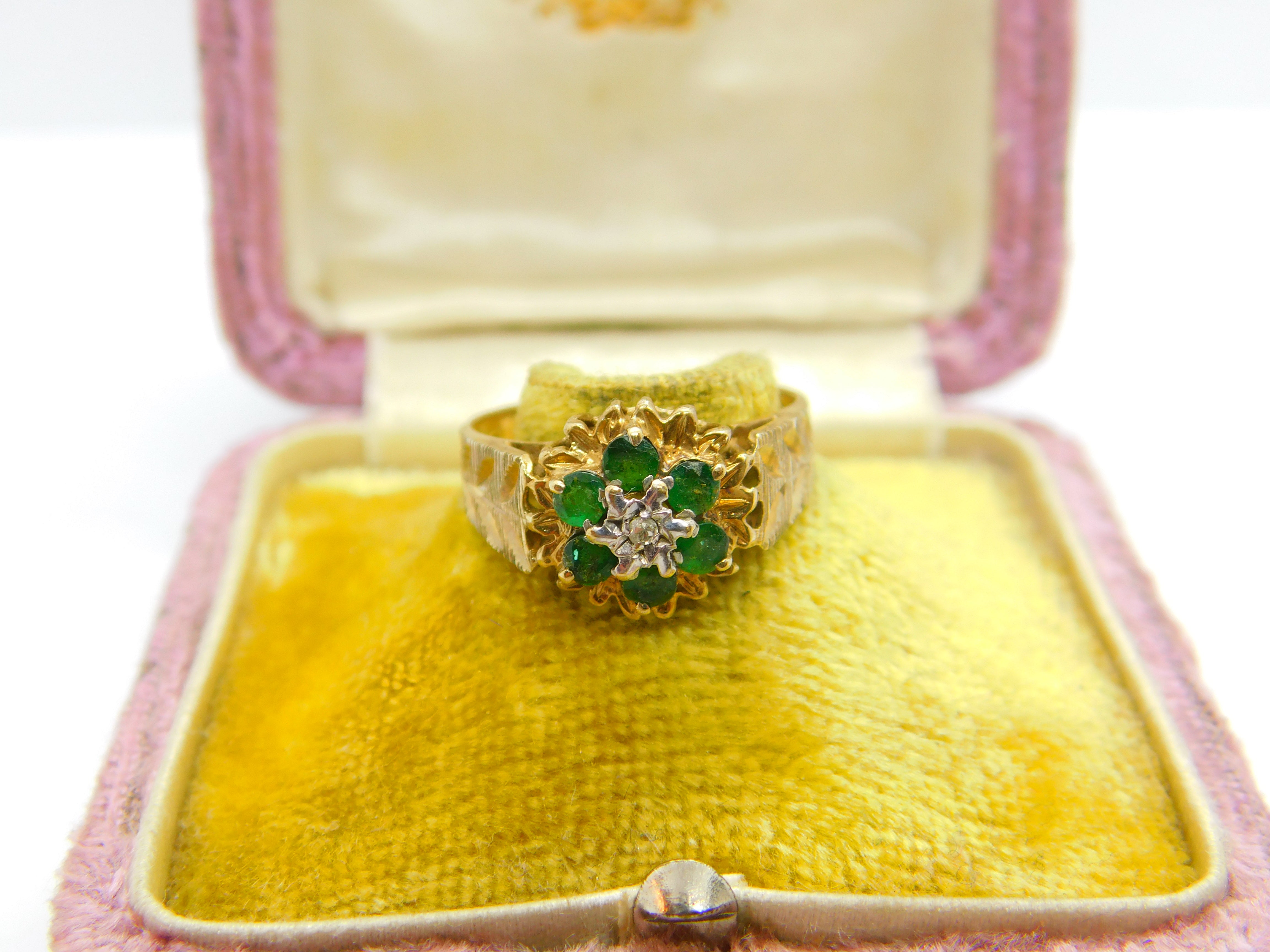 9ct Yellow Gold, Emerald & Diamond Floral Cluster Ring Vintage 1978 London