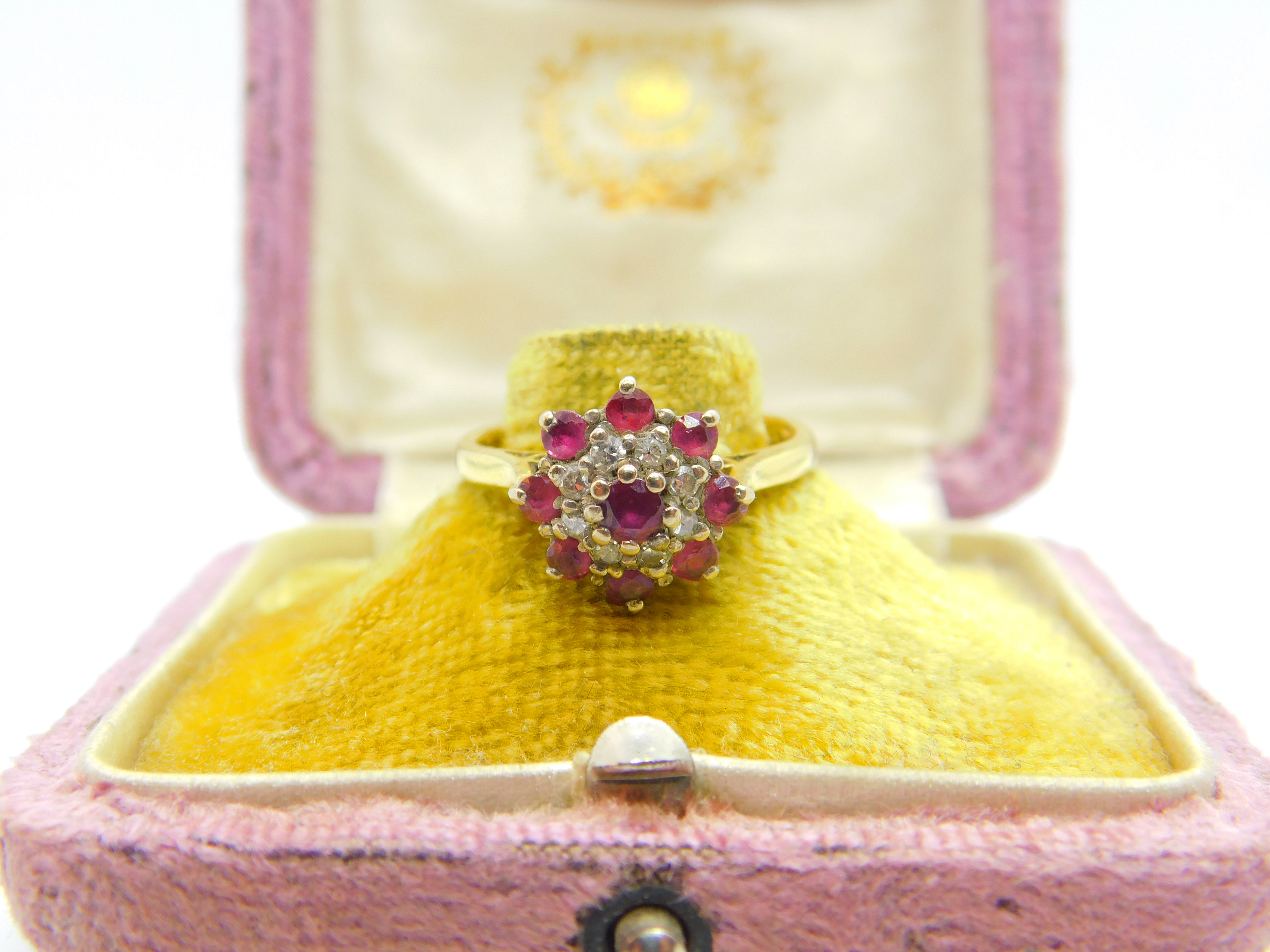 18ct Yellow Gold, Ruby & Diamond Floral Cluster Ring Vintage 1978 London