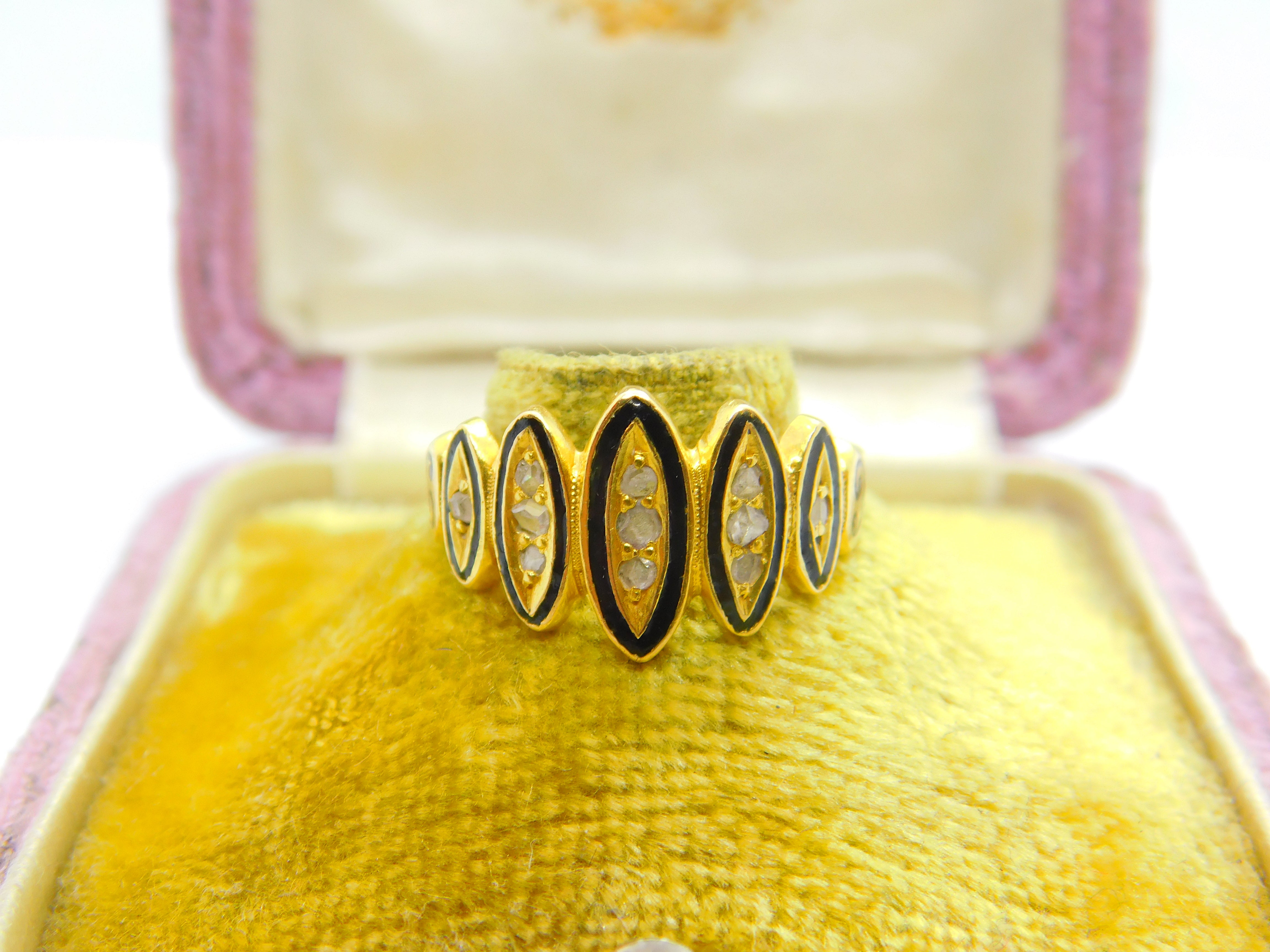 Victorian 18ct Gold, Black Enamel & Rose Cut Diamond Mourning Ring 1871 London