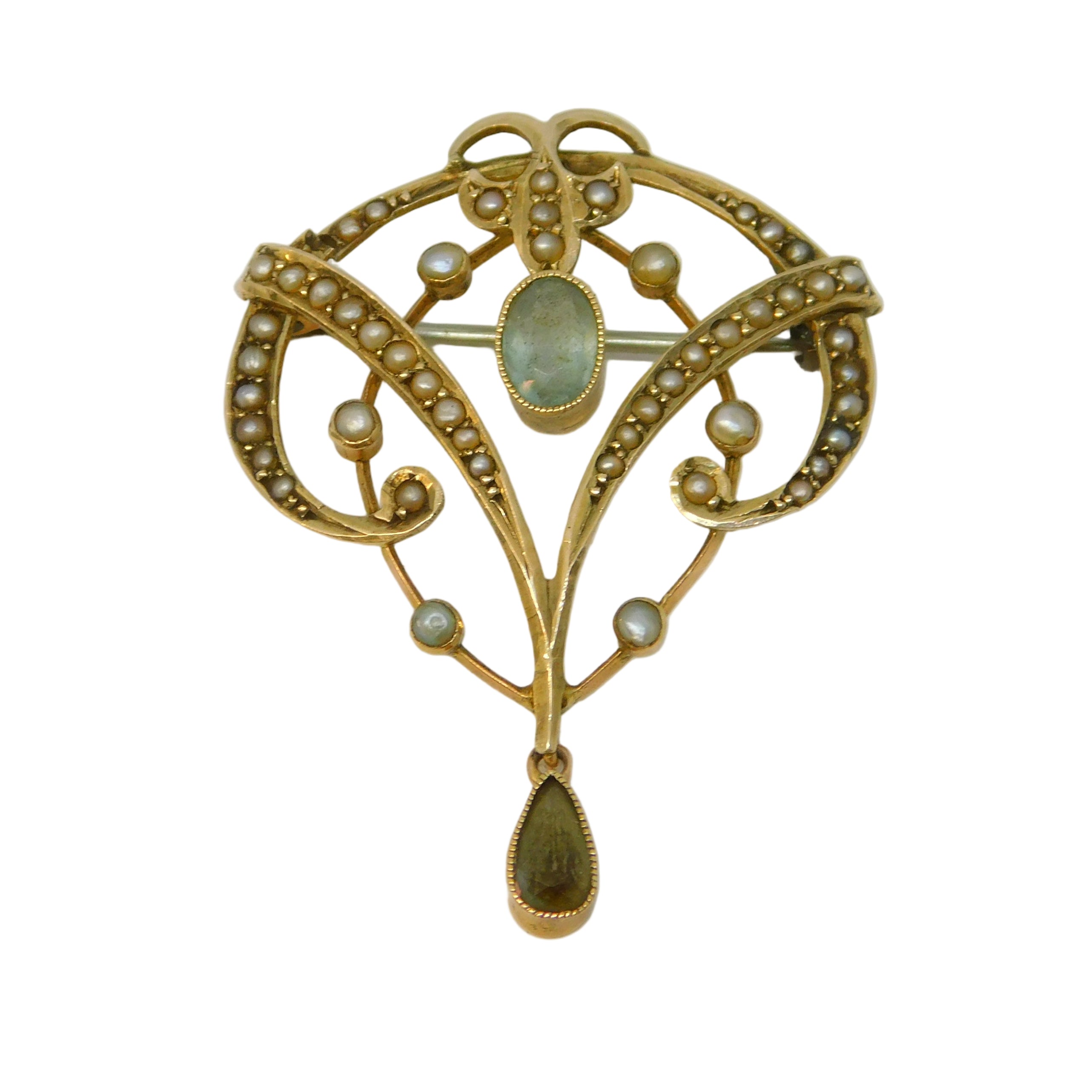 Edwardian 9ct Yellow Gold, Seed Pearl & Topaz Lavalier Brooch Antique c1910