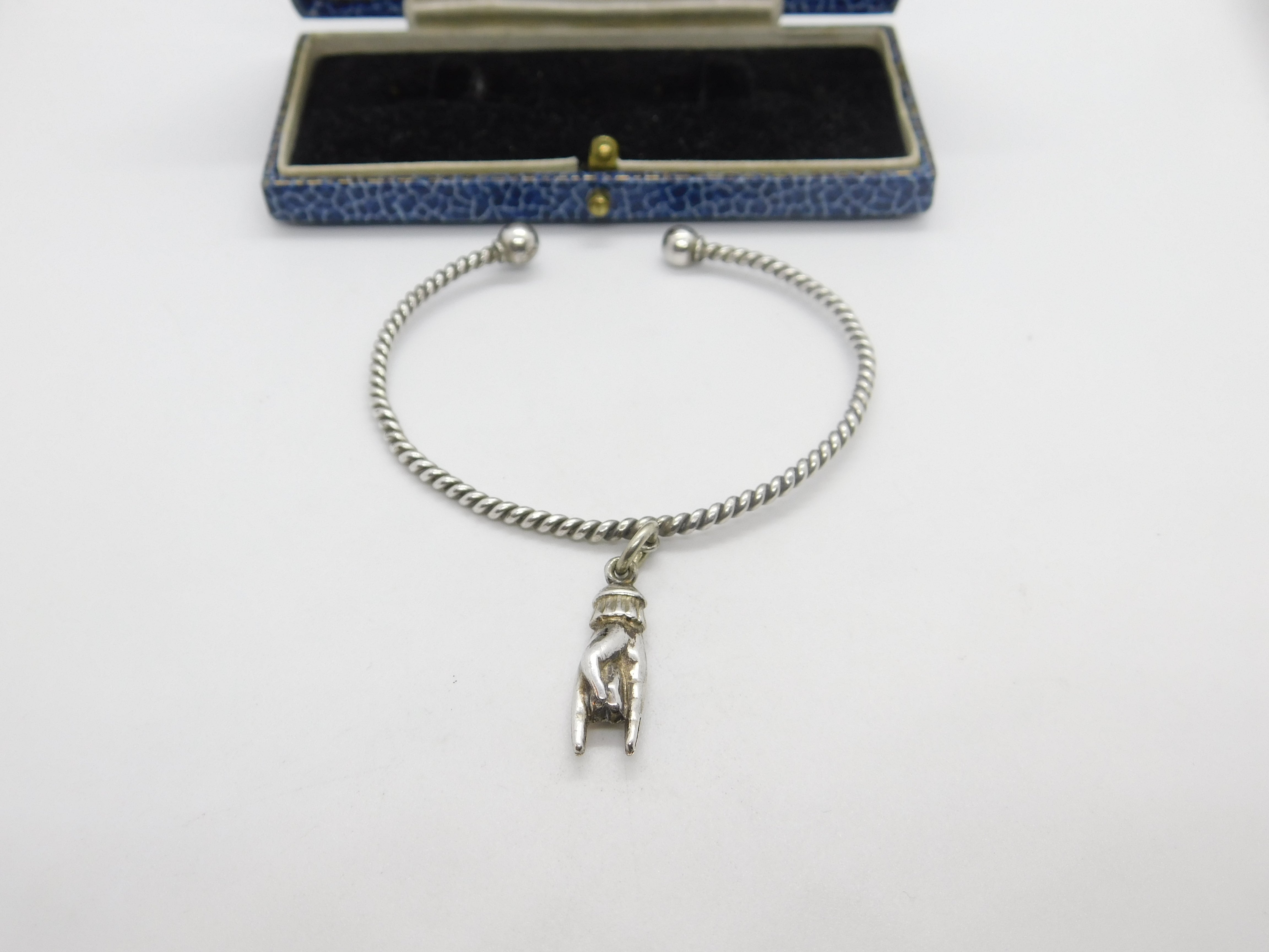 Sterling Silver Rope Twist Figa Hand Bangle Bracelet Antique c1920 Art Deco