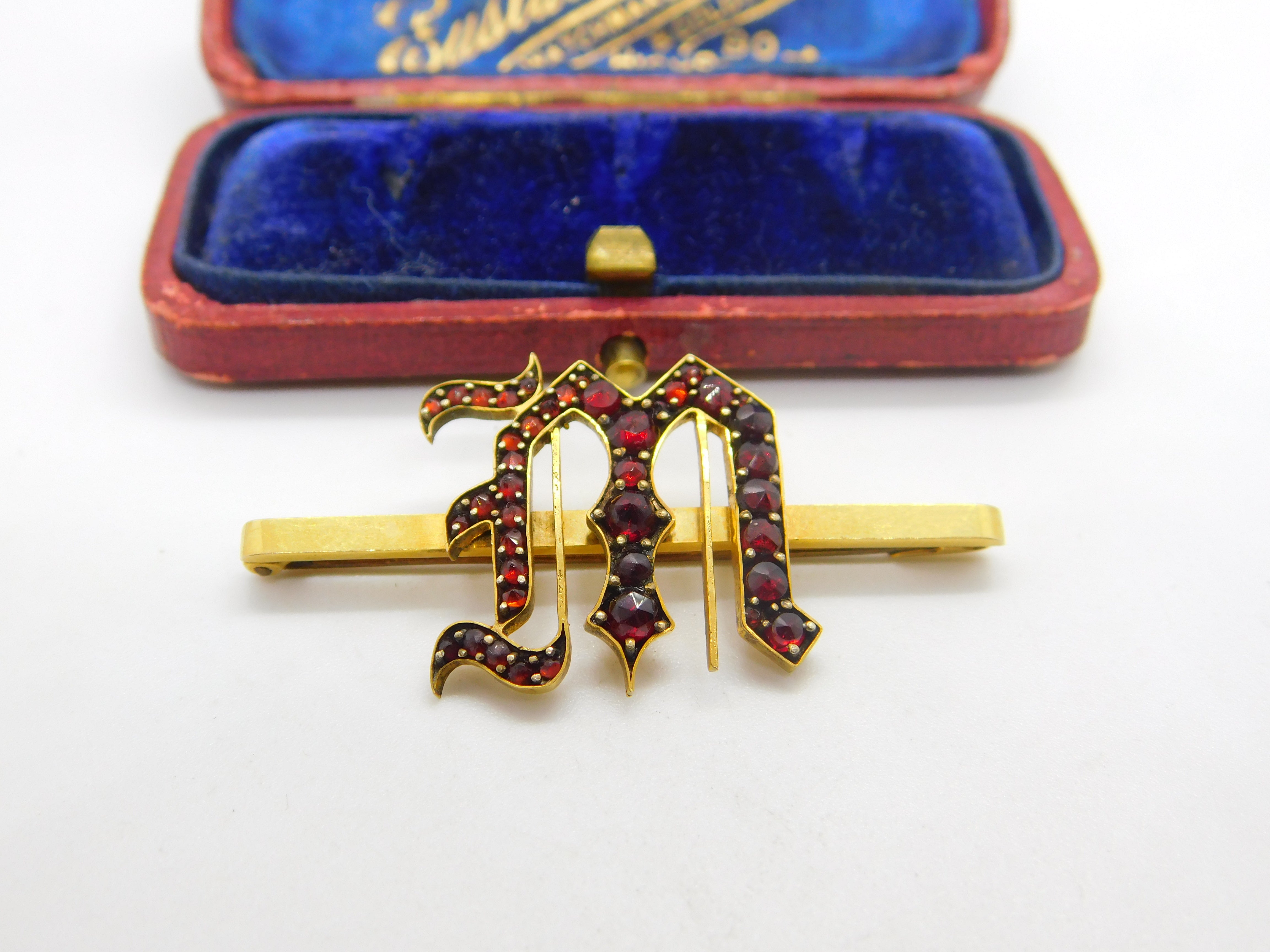 Victorian 9ct Yellow Gold Bohemian Garnet Set 'M Initial Brooch Antique c1860