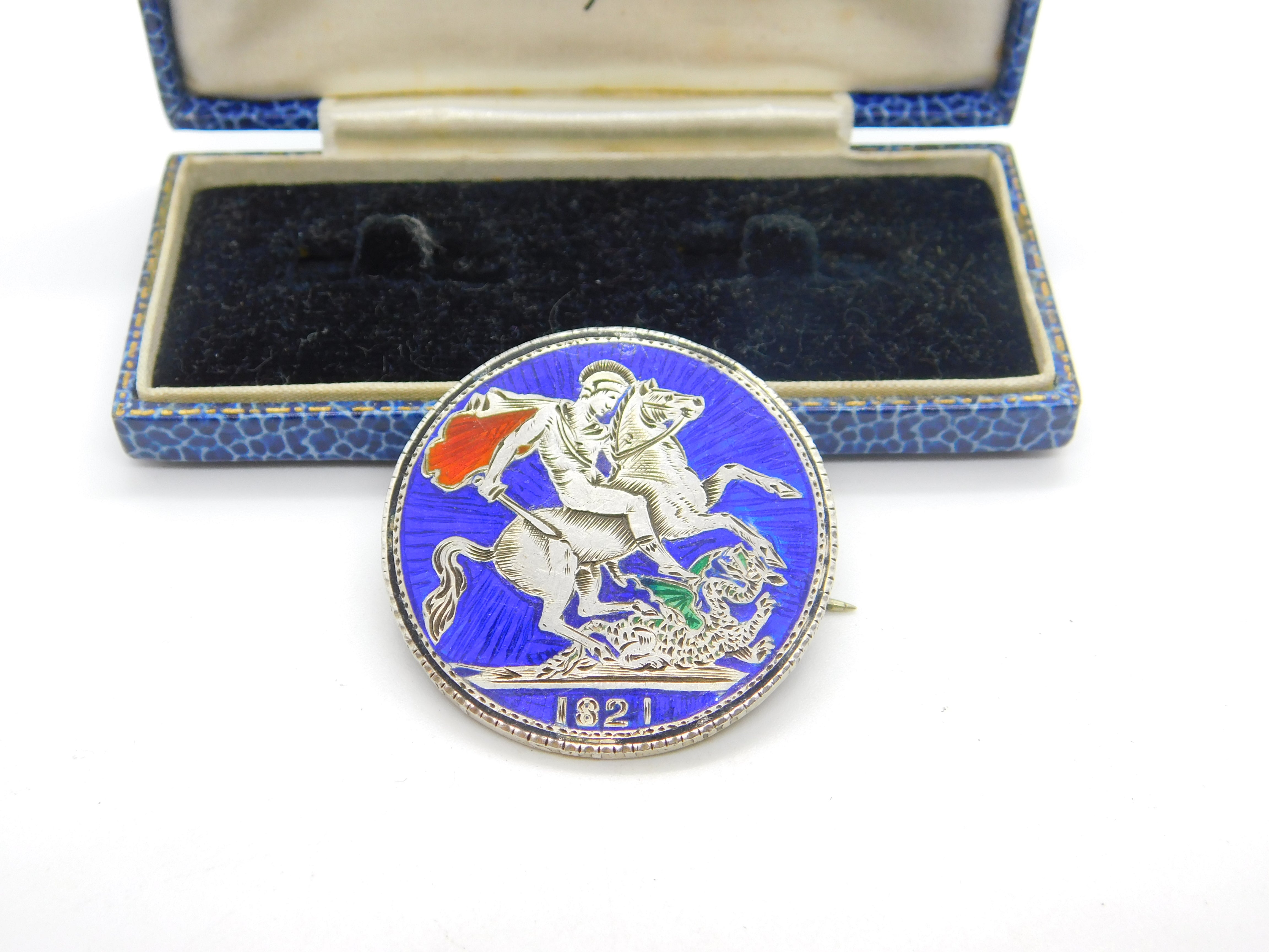 Georgian Sterling Silver & Enamel Crown Coin Brooch Pin Antique 1821