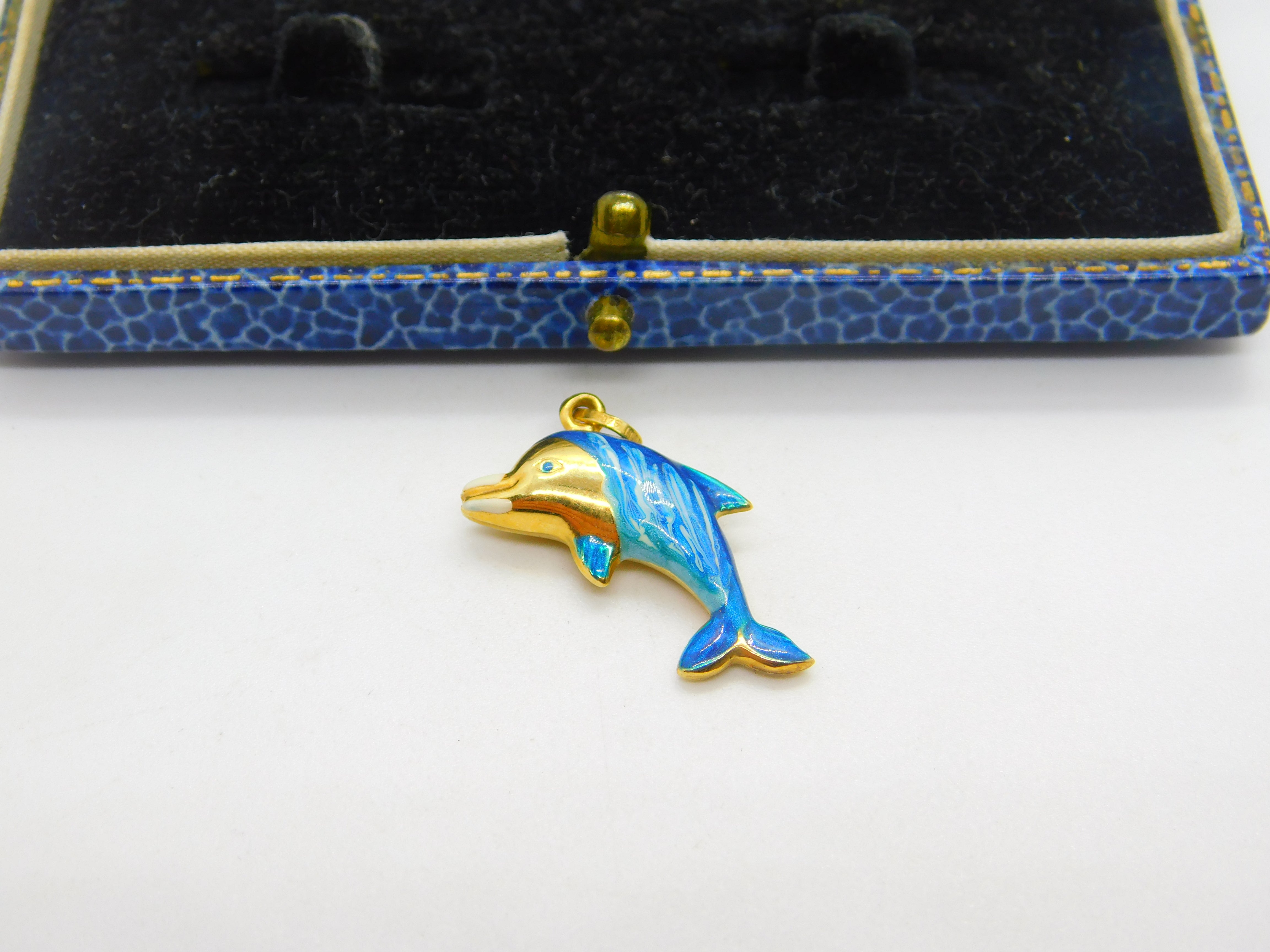 Italian 9ct Gold & Blue Enamel Leaping Dolphin Charm or Pendant Vintage c1980
