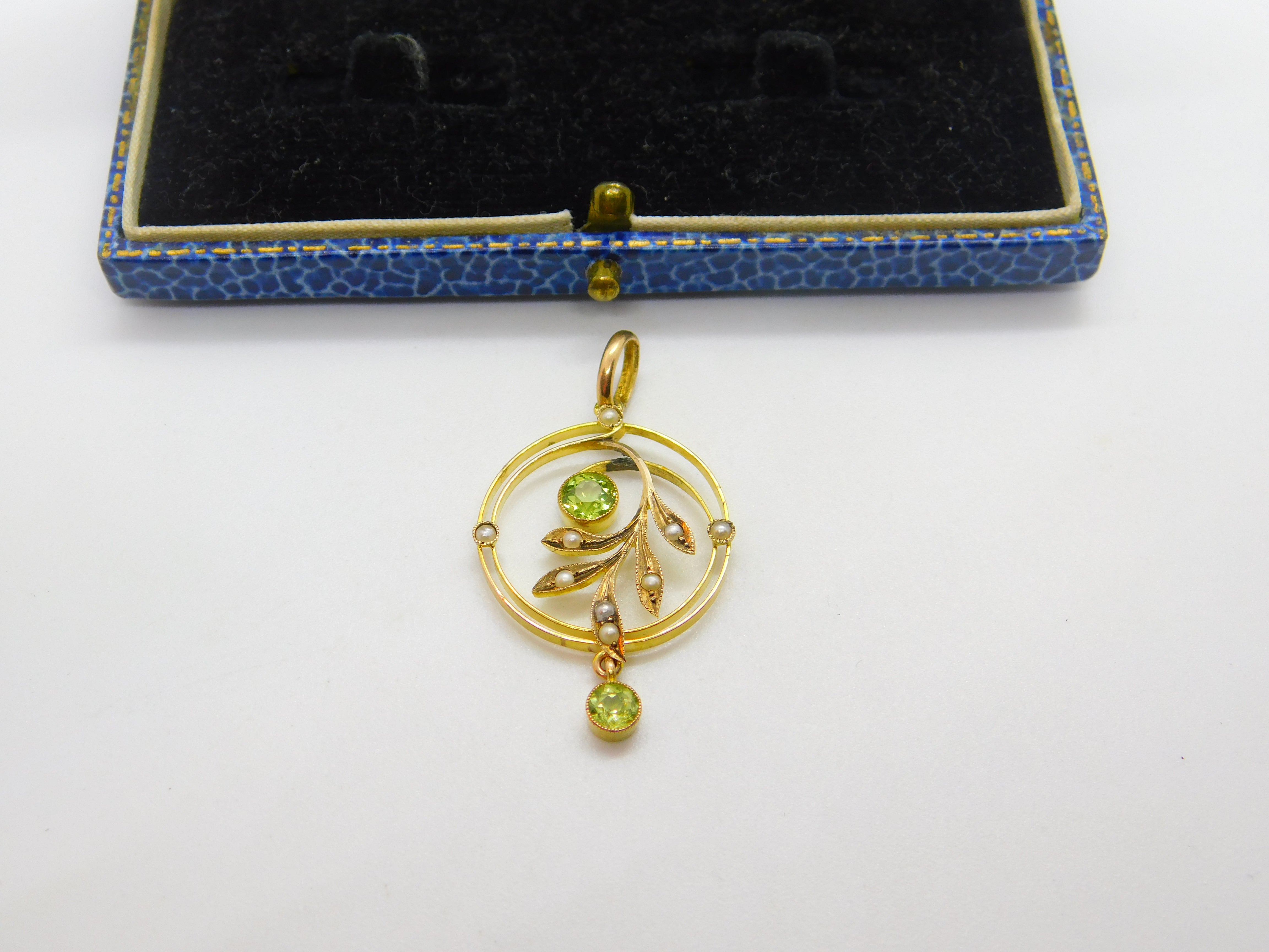 Edwardian 9ct Gold, Peridot & Seed Pearl Suffragette Lavalier Pendant Antique