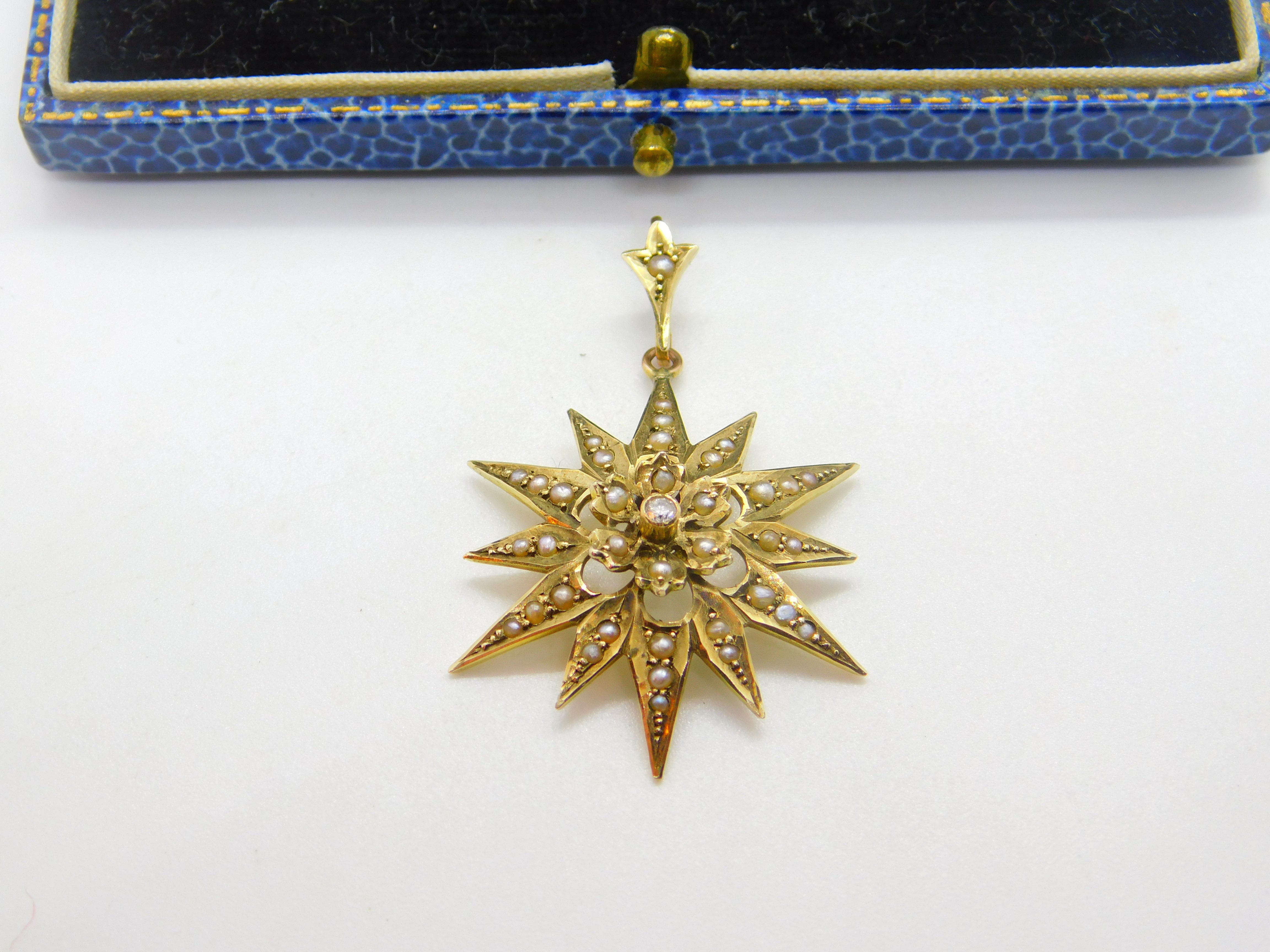 Edwardian 9ct Gold, Seed Pearl & Diamond Starburst Drop Pendant Antique c1910