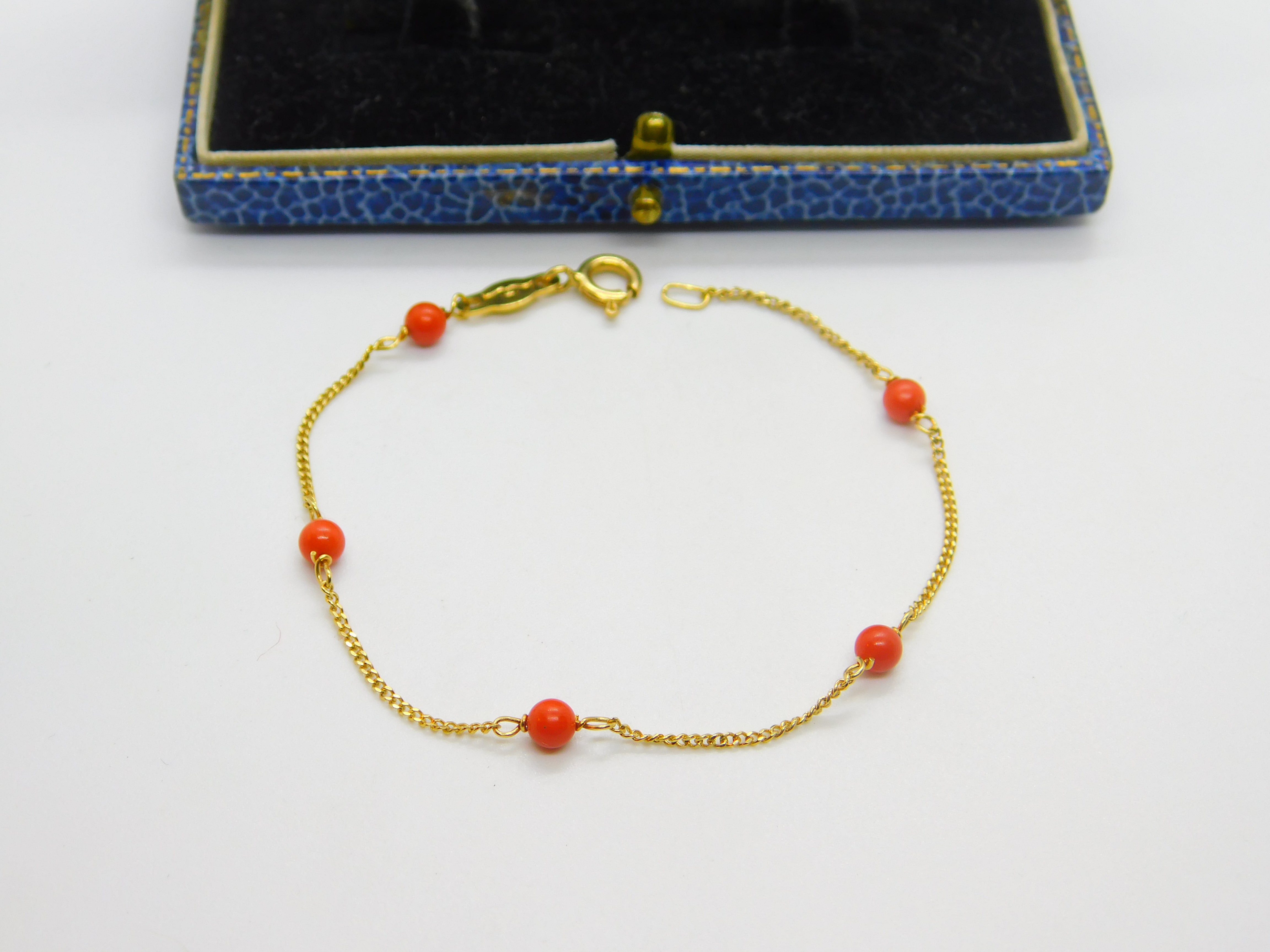 18ct Yellow Gold & Red Coral Bead Bracelet Vintage c1980 6.8" Length
