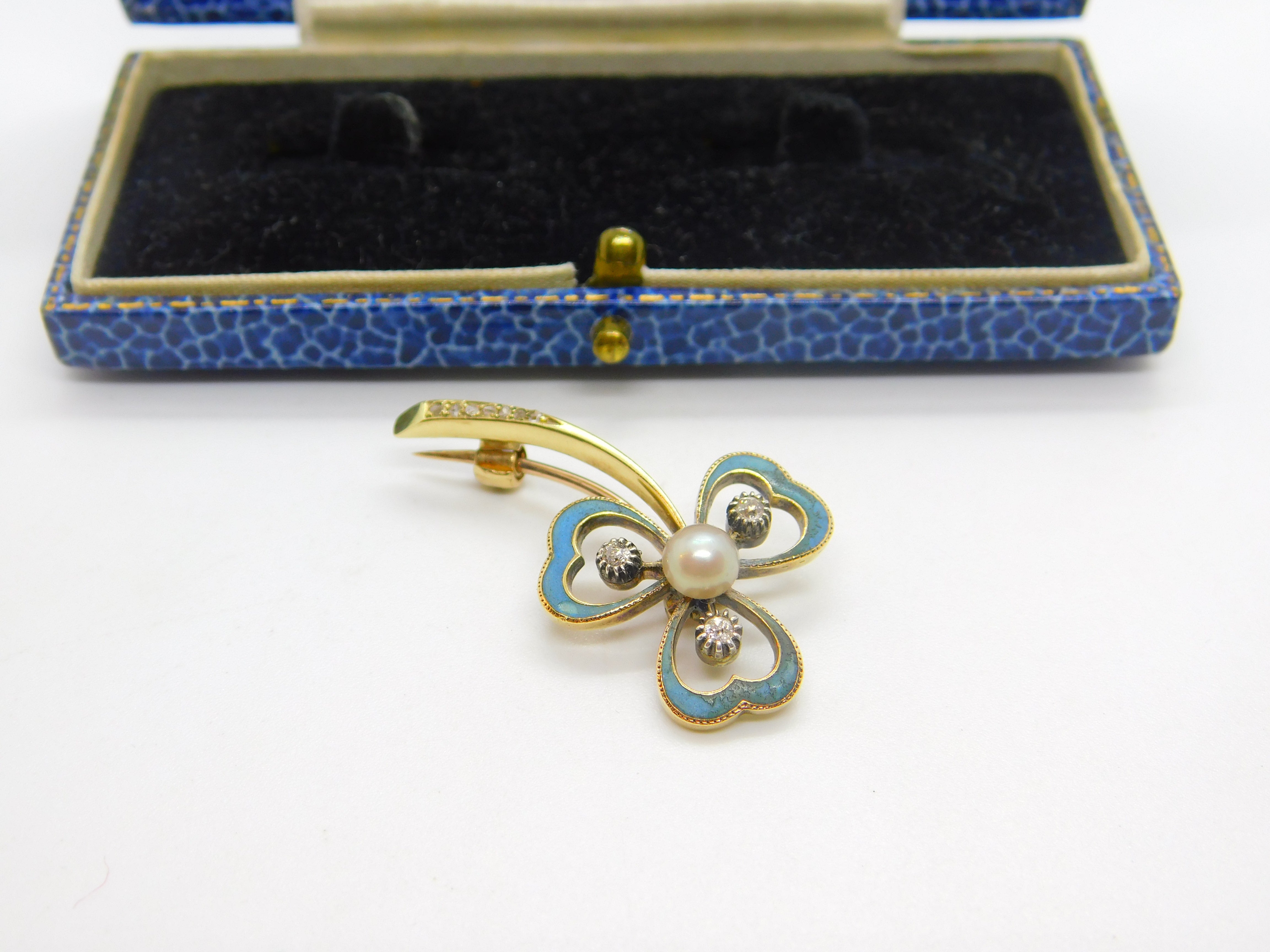 Victorian 18ct Gold, Blue Enamel, Diamond & Pearl Shamrock Brooch Antique c1890