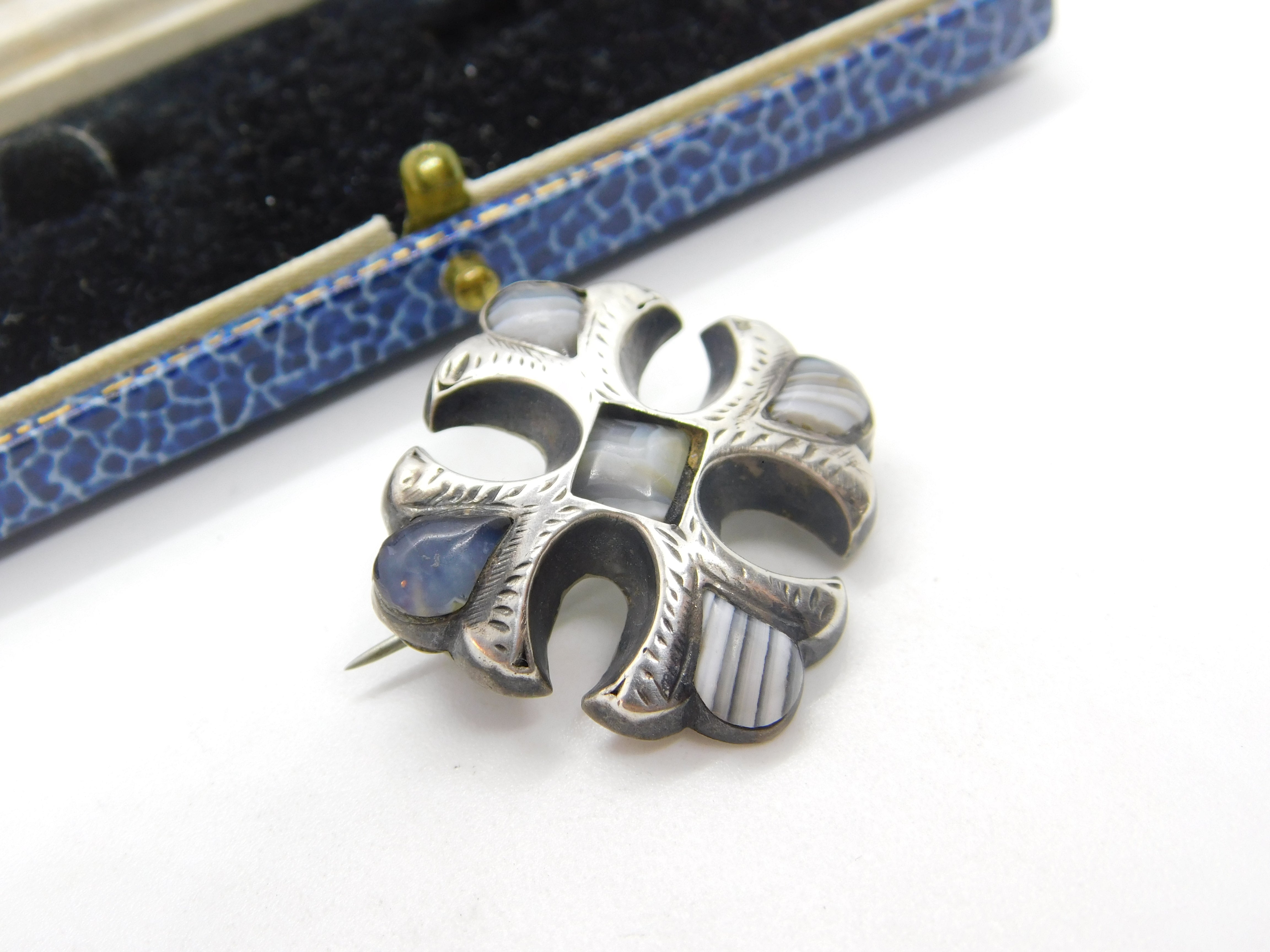 Scottish Victorian Sterling Silver & Montrose Agate Celtic Cross Brooch Antique c1860