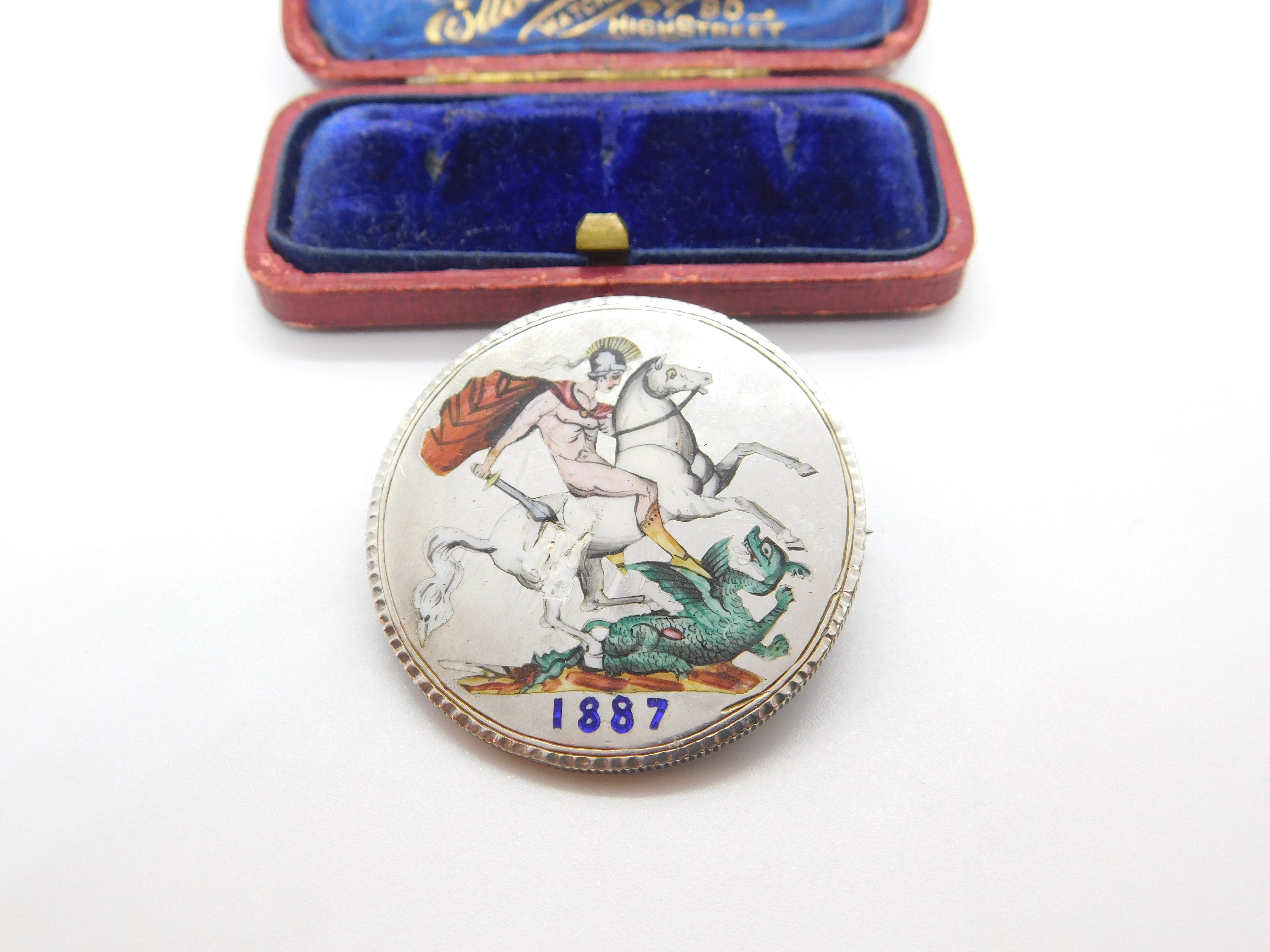 Victorian Sterling Silver & Enamel Crown Coin Brooch Antique 1887 Jubilee