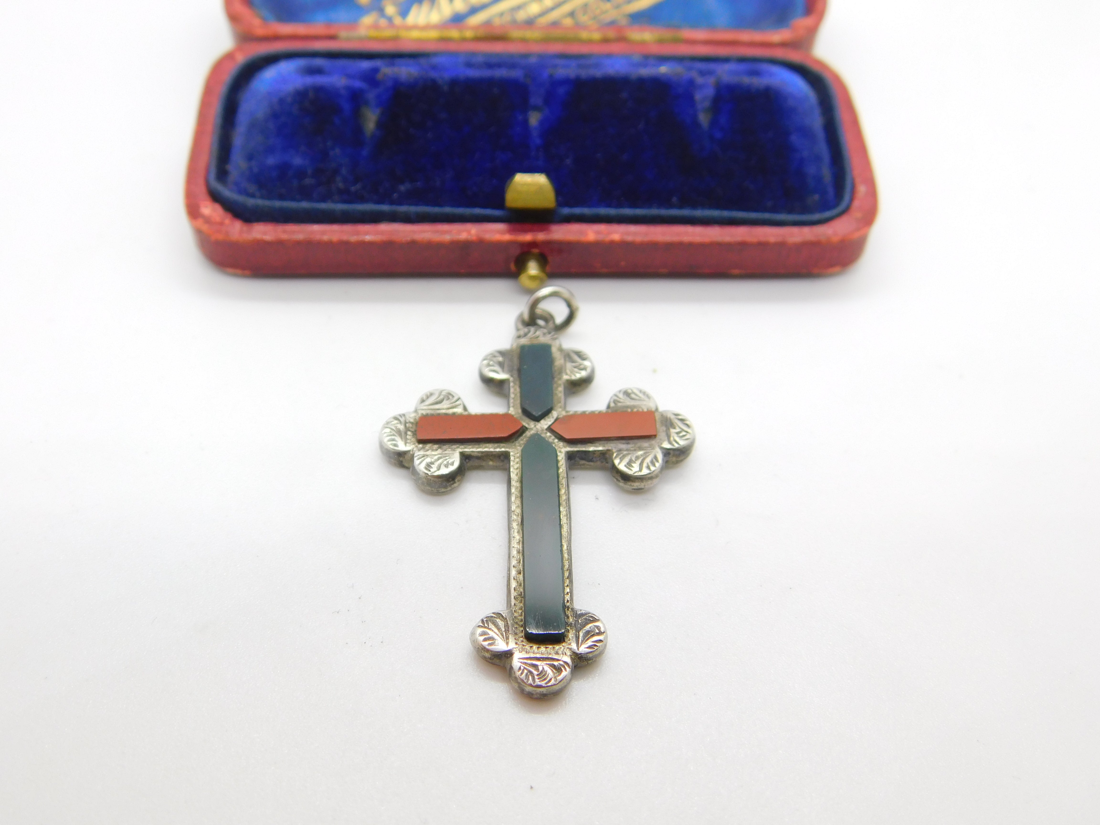 Victorian Sterling Silver Bloodstone & Agate Crucifix Pendant Antique c1860
