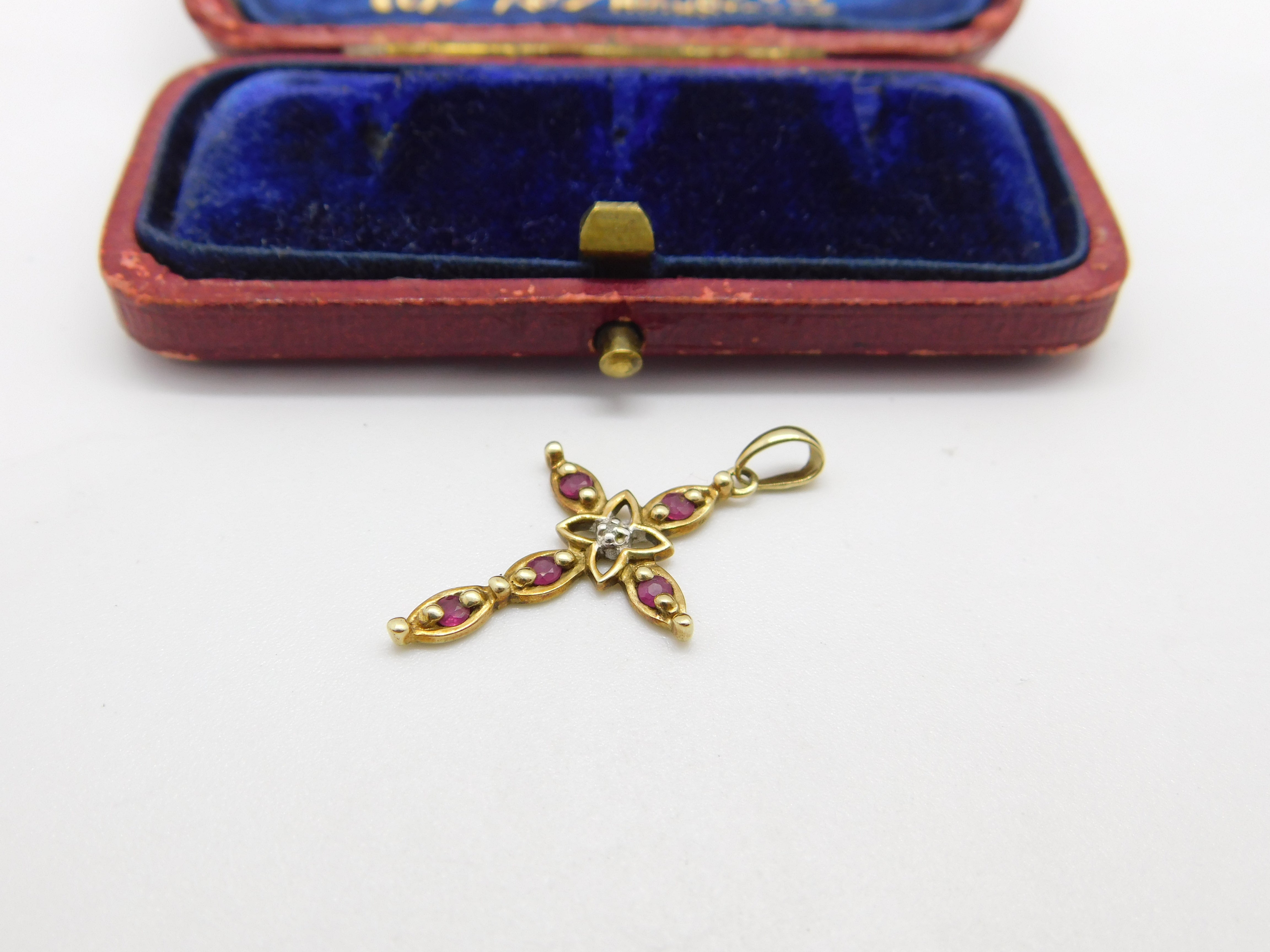 9ct Yellow Gold, Ruby & Diamond Cross Crucifix Pendant Vintage c1980