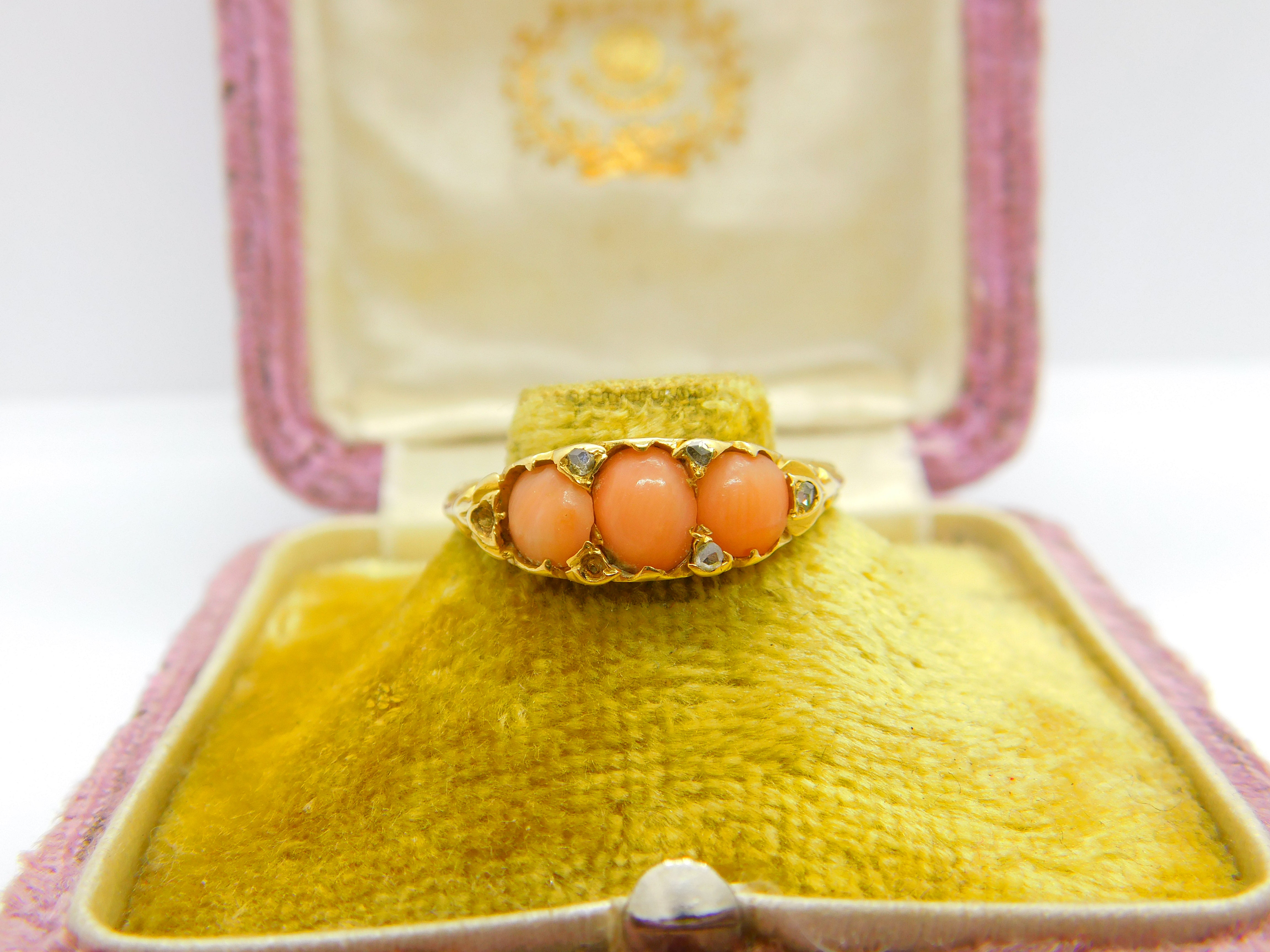 Victorian 18ct Yellow Gold, Red Coral & Diamond Band Ring Antique c1890