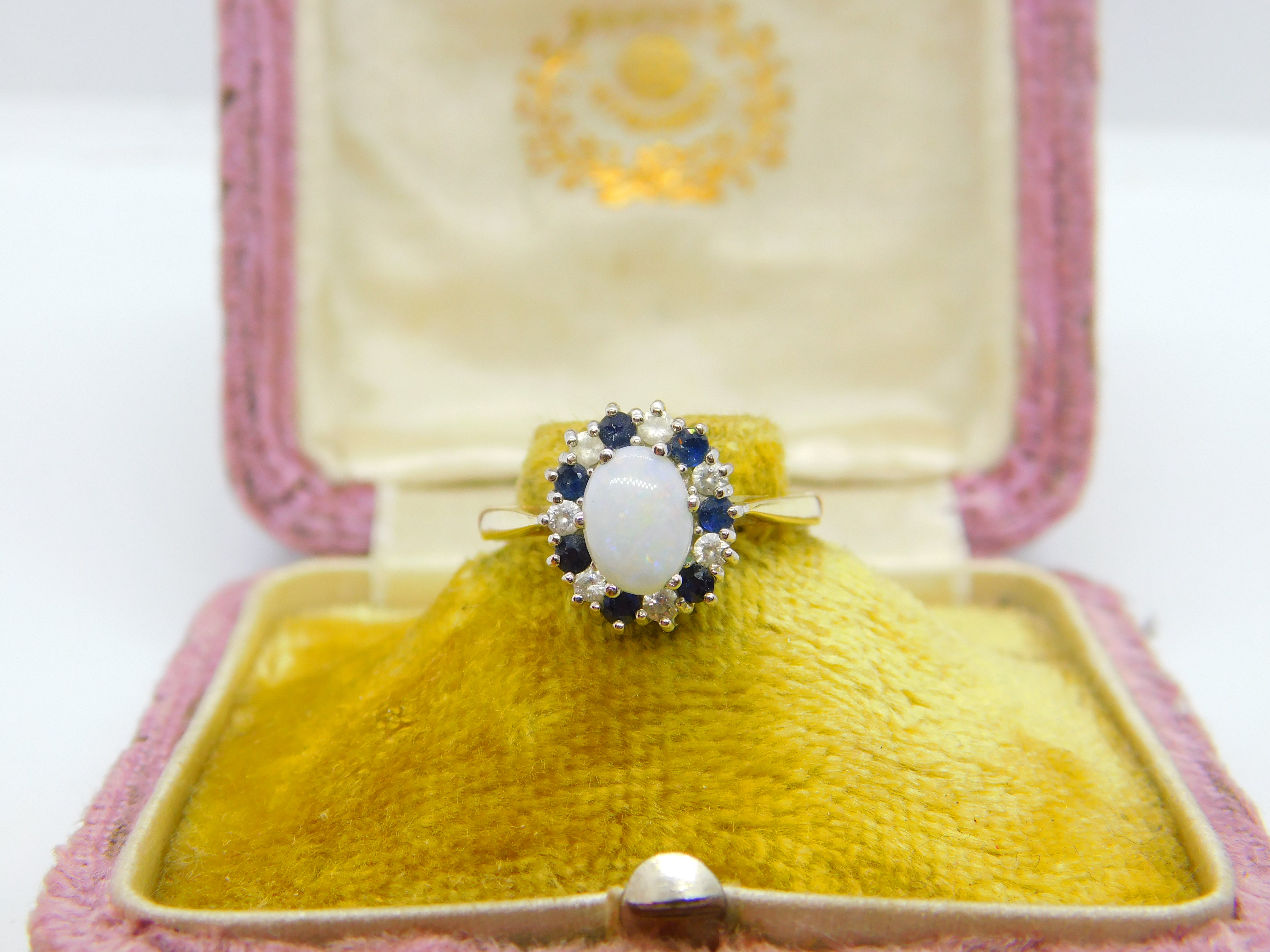 9ct Yellow Gold, Sapphire, Fire Opal & Diamond Paste Floral Ring Vintage 1986