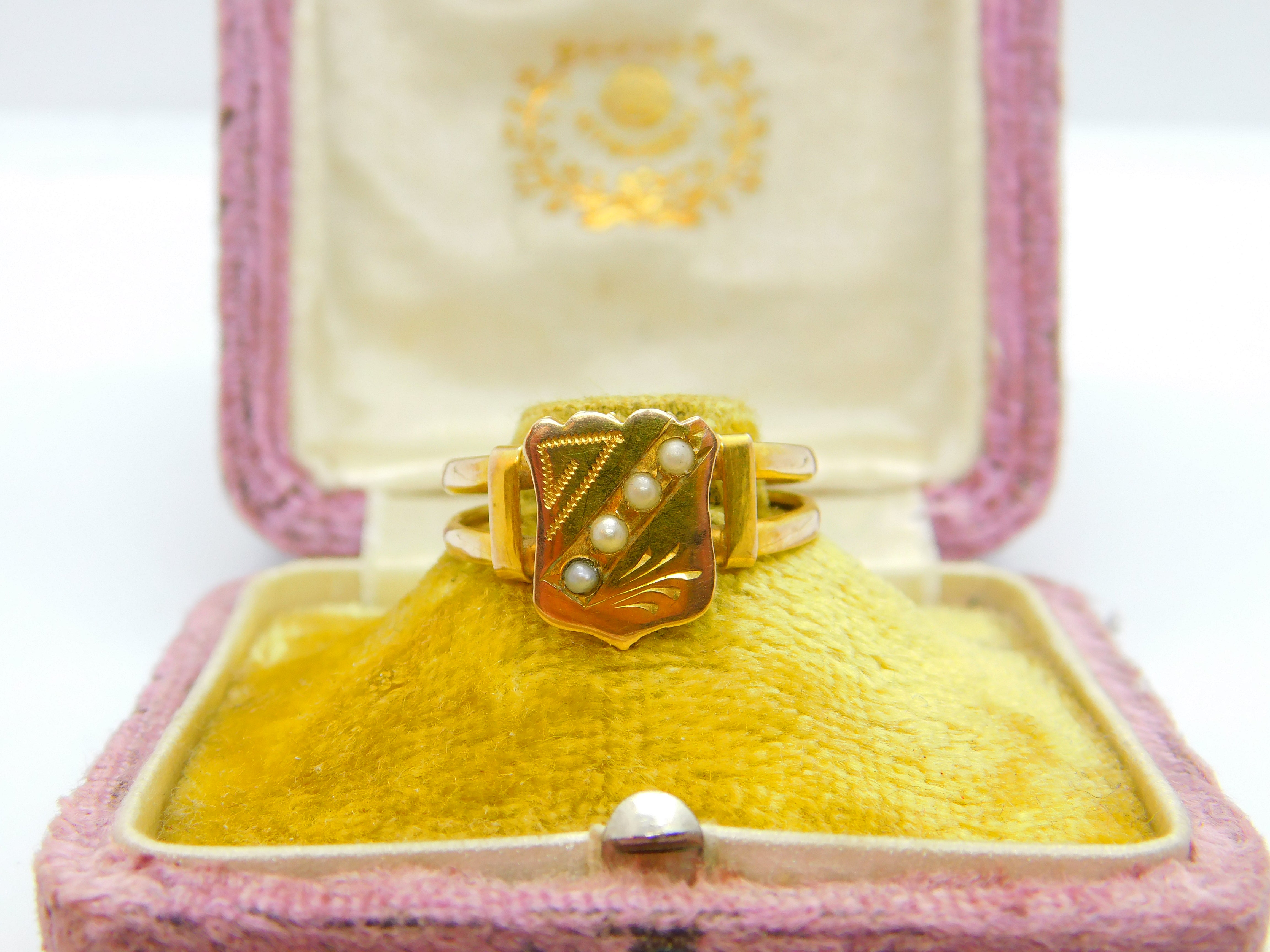 Victorian 12ct Yellow Gold & Seed Pearl Set Shield Ring Antique c1880