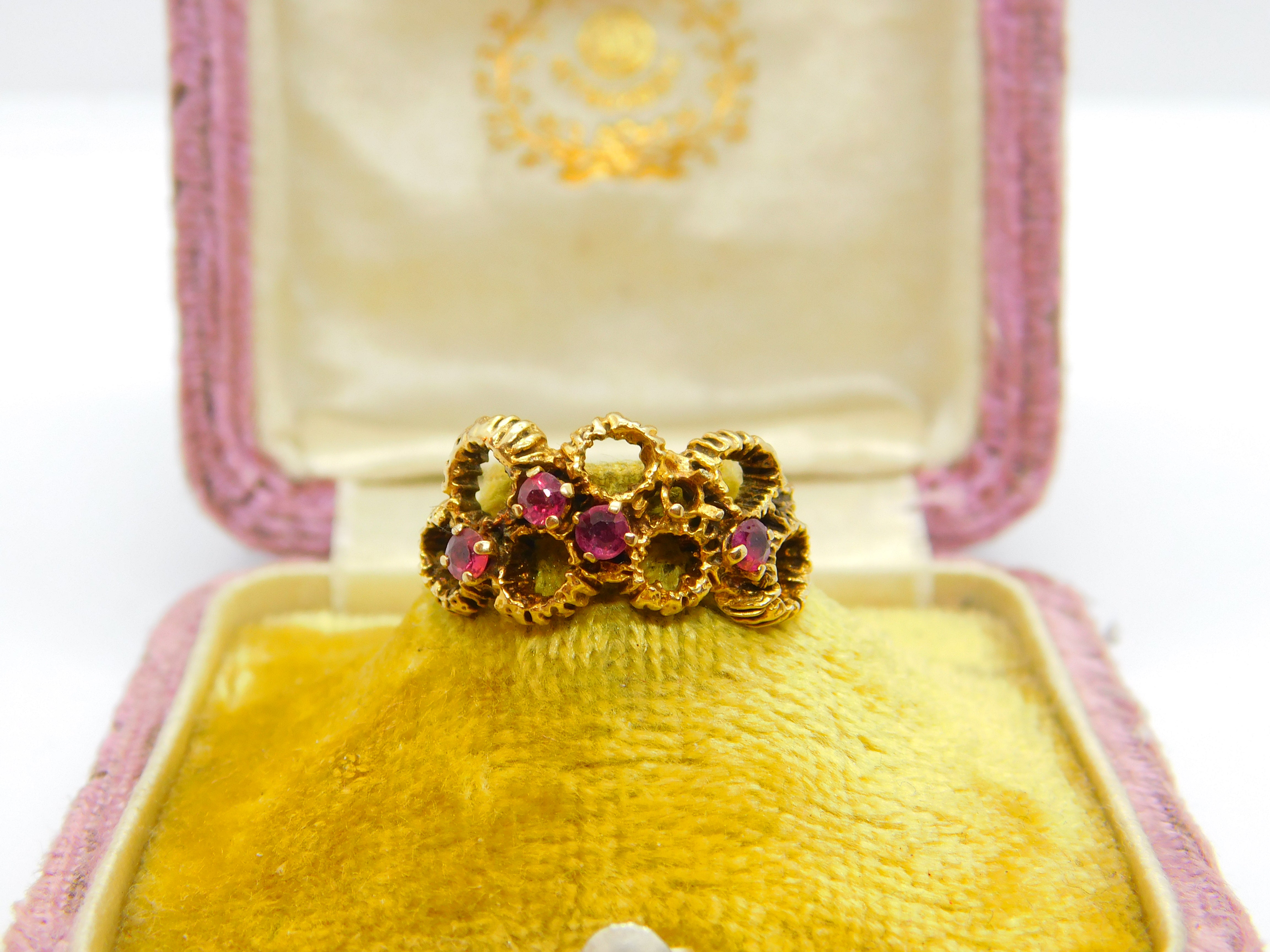 9ct Yellow Gold & Modernist Swirl Form Ruby Set Band Ring VIntage 1971 London