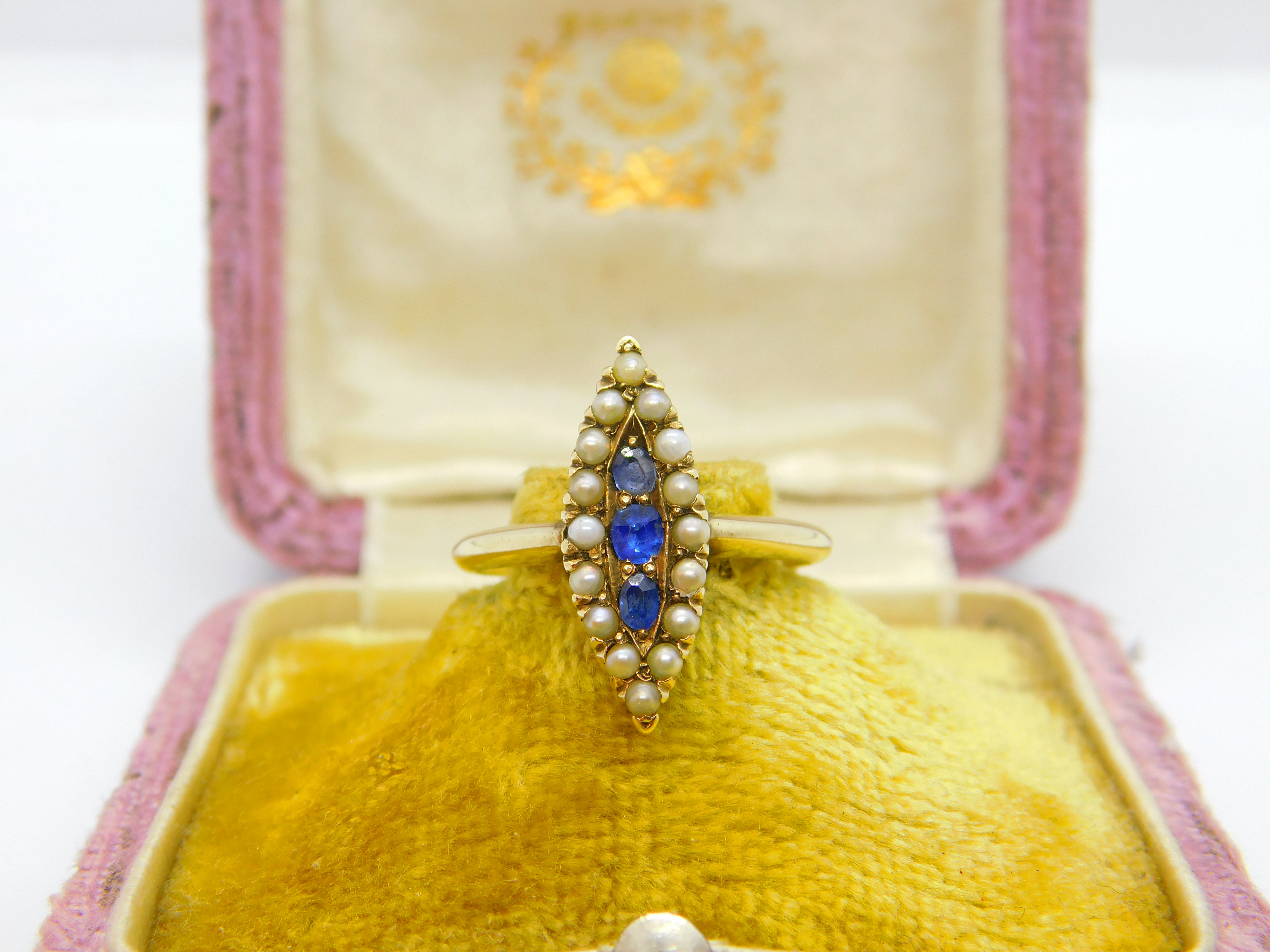Austro-Hungarian 14ct Gold, Seed Pearl & Sapphire Marquise Form Ring Antique