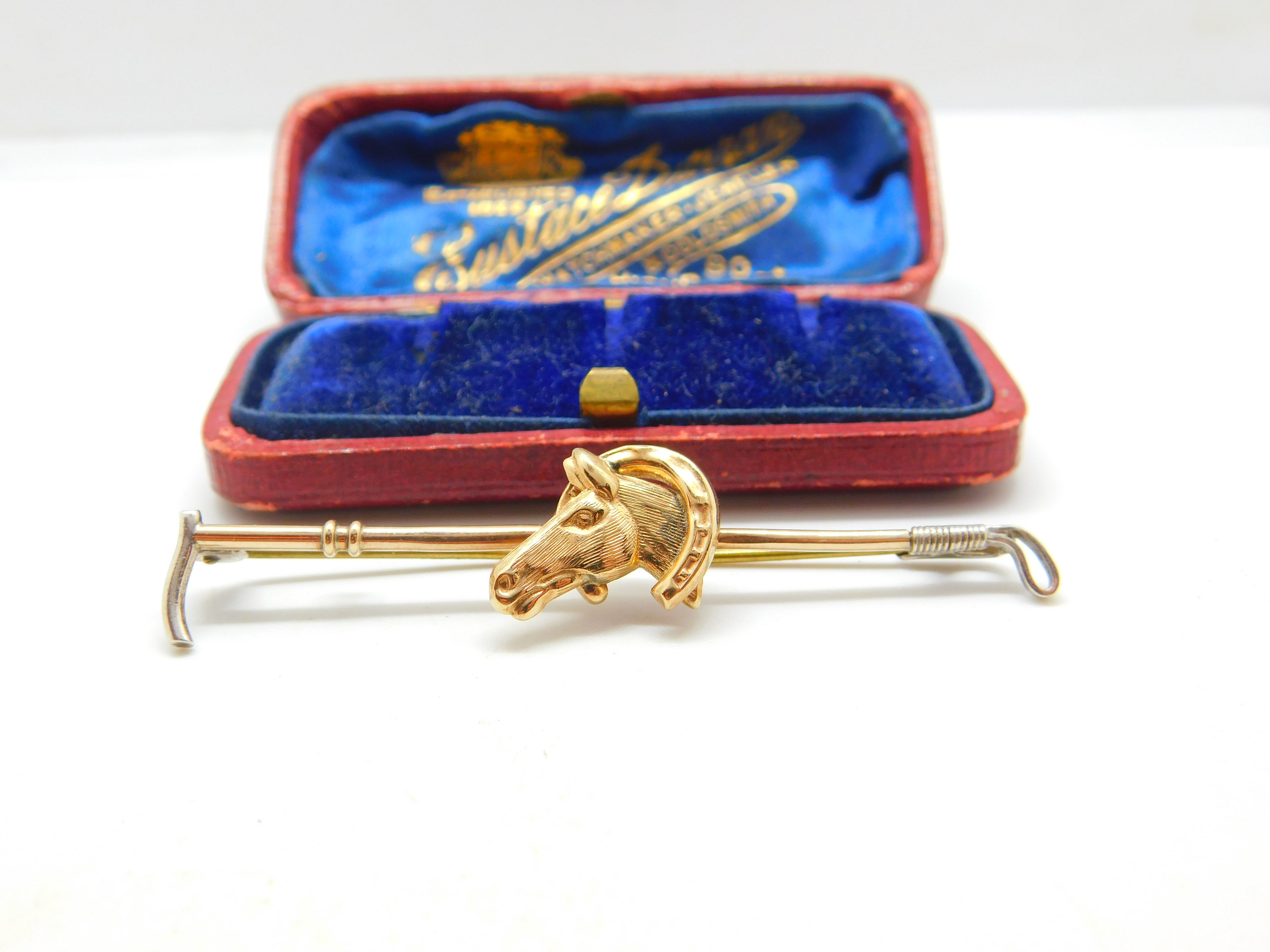 9ct Yellow Gold Hunting Crop, Shoe & Horses Head Stock Pin Brooch Antique