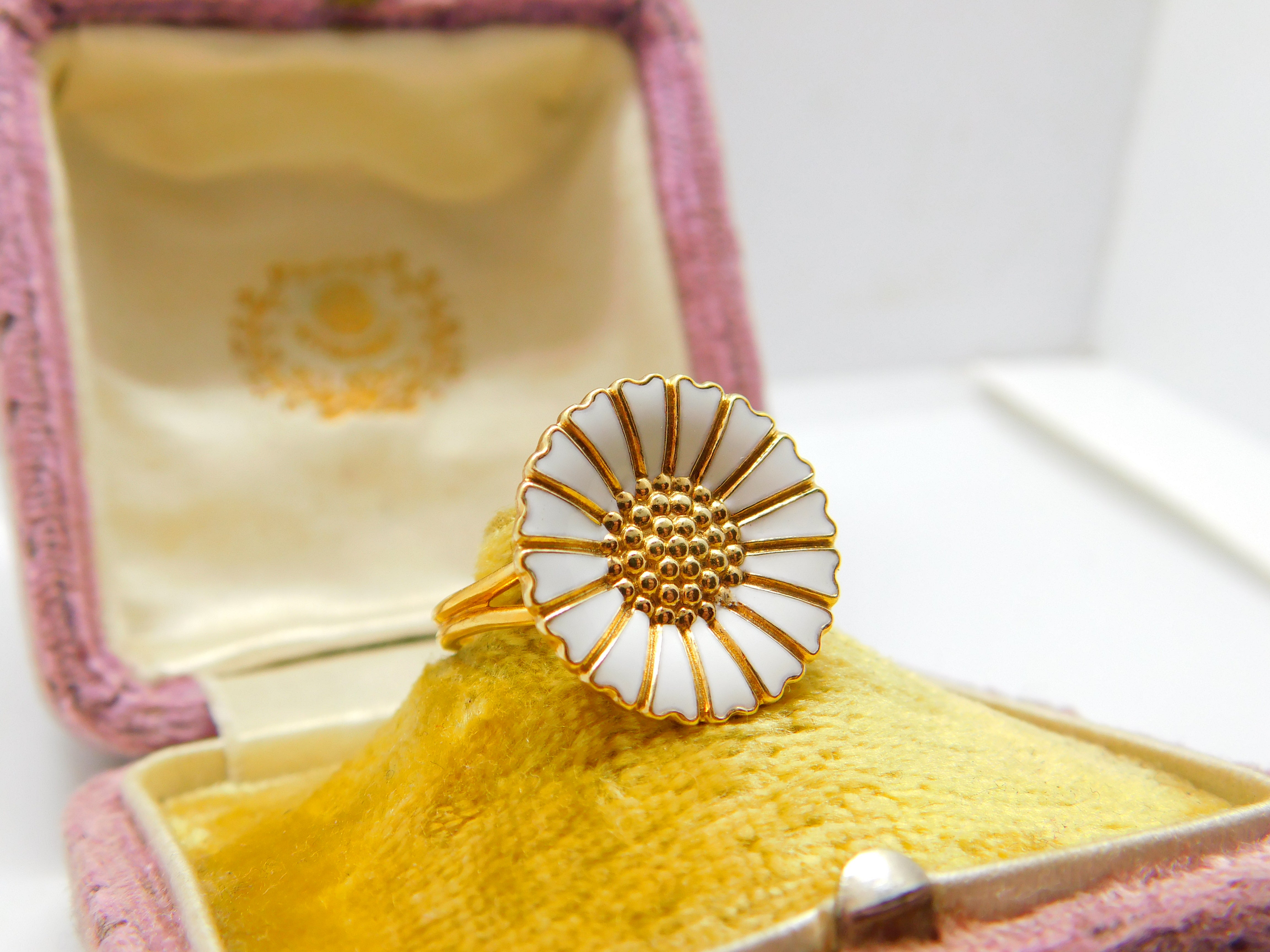 Danish Sterling Silver Gilt & White Enamel Daisy Flower Band Ring Mid-Century
