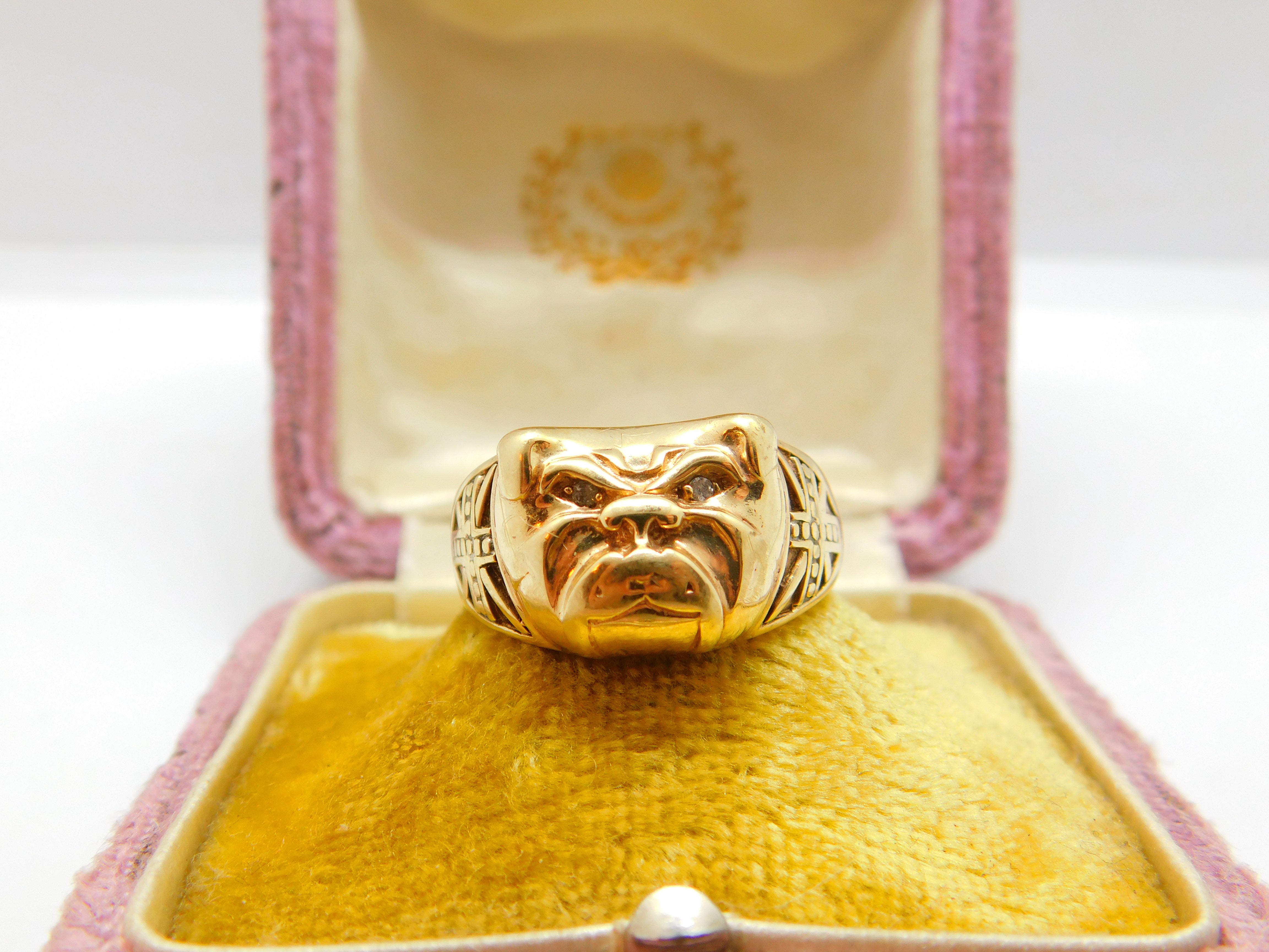 9ct Yellow Gold & Diamond Set British Bulldog Band Ring Vintage c1970