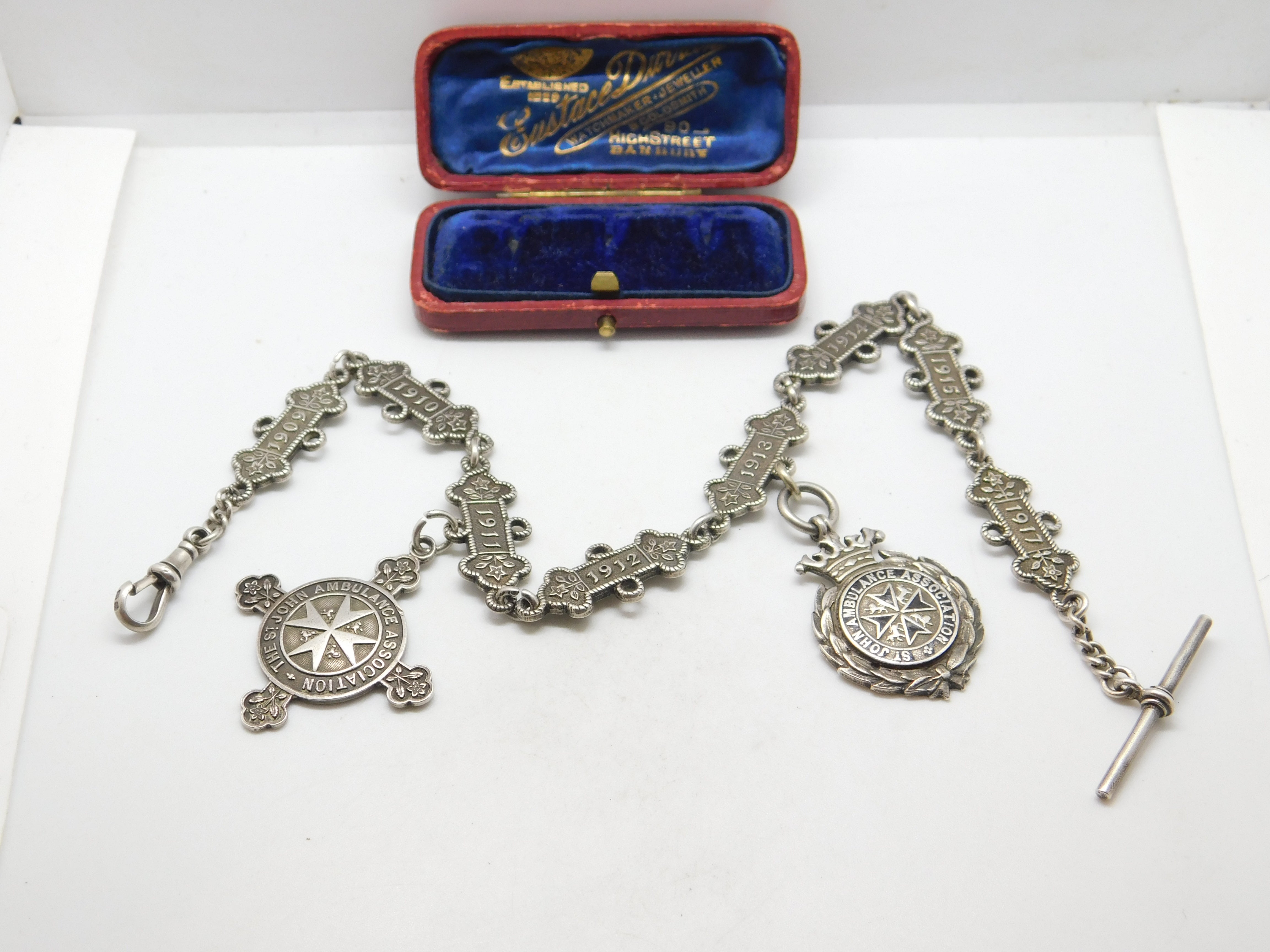 Sterling Silver St. John's Ambulance 'Joseph Jackson' Watch Chain Antique 1909-1917 Fobs & Dates