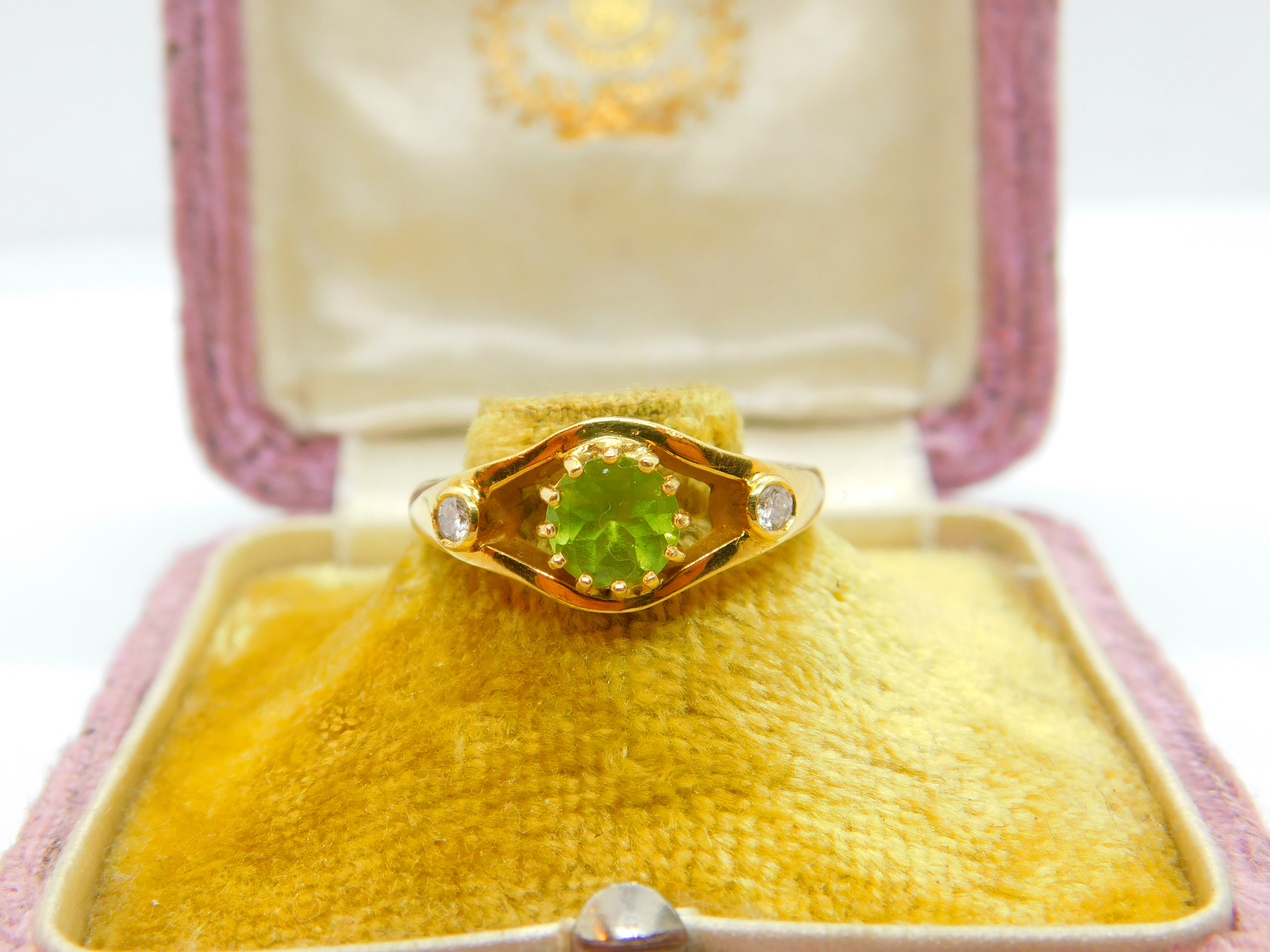 18ct Yellow Gold, Peridot & 0.1ct Diamond Art Nouveau Style Ring Vintage c1970