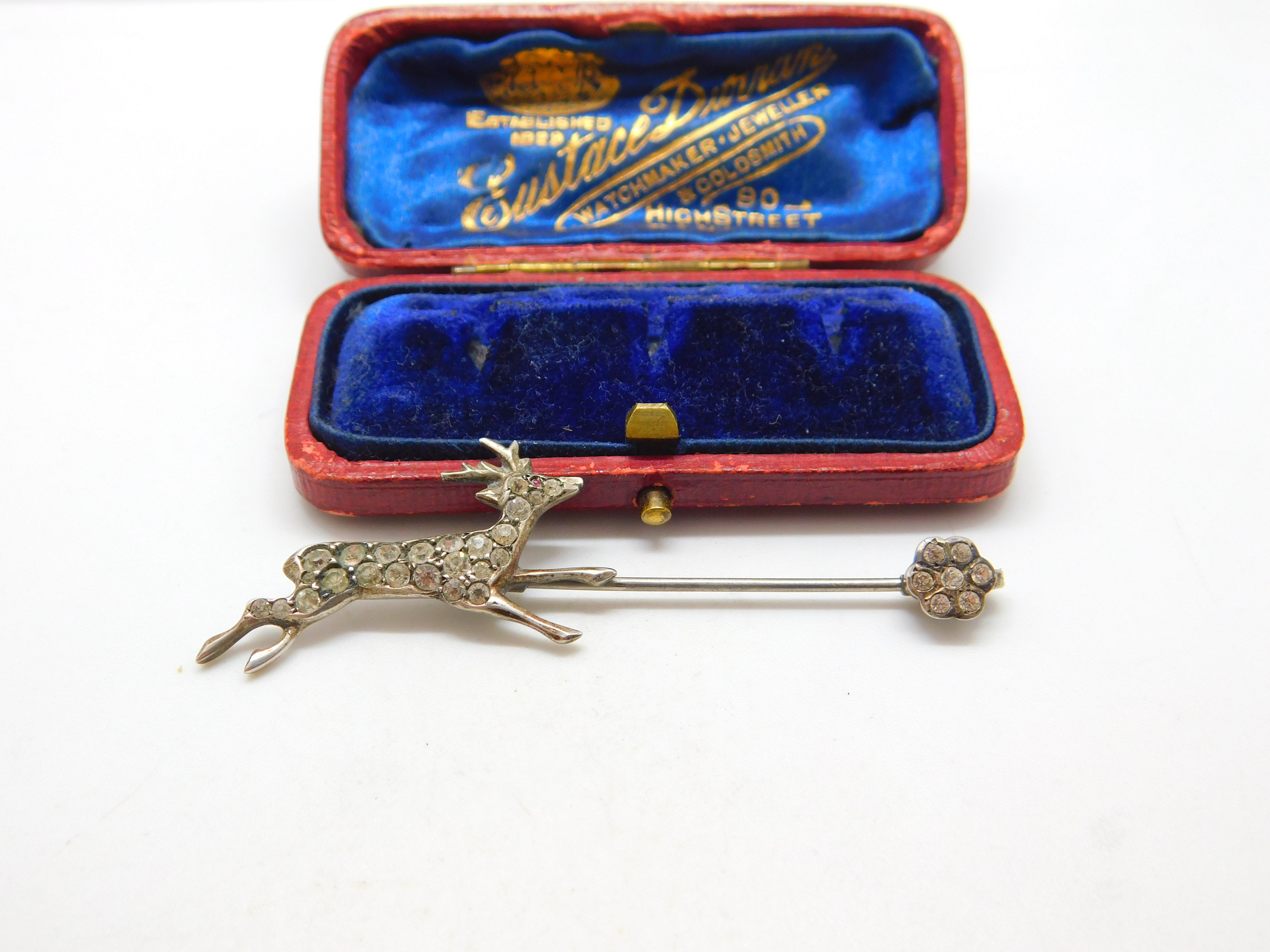 Victorian .900 Silver & Diamond Paste Running Deer Floral Brooch Pin Antique