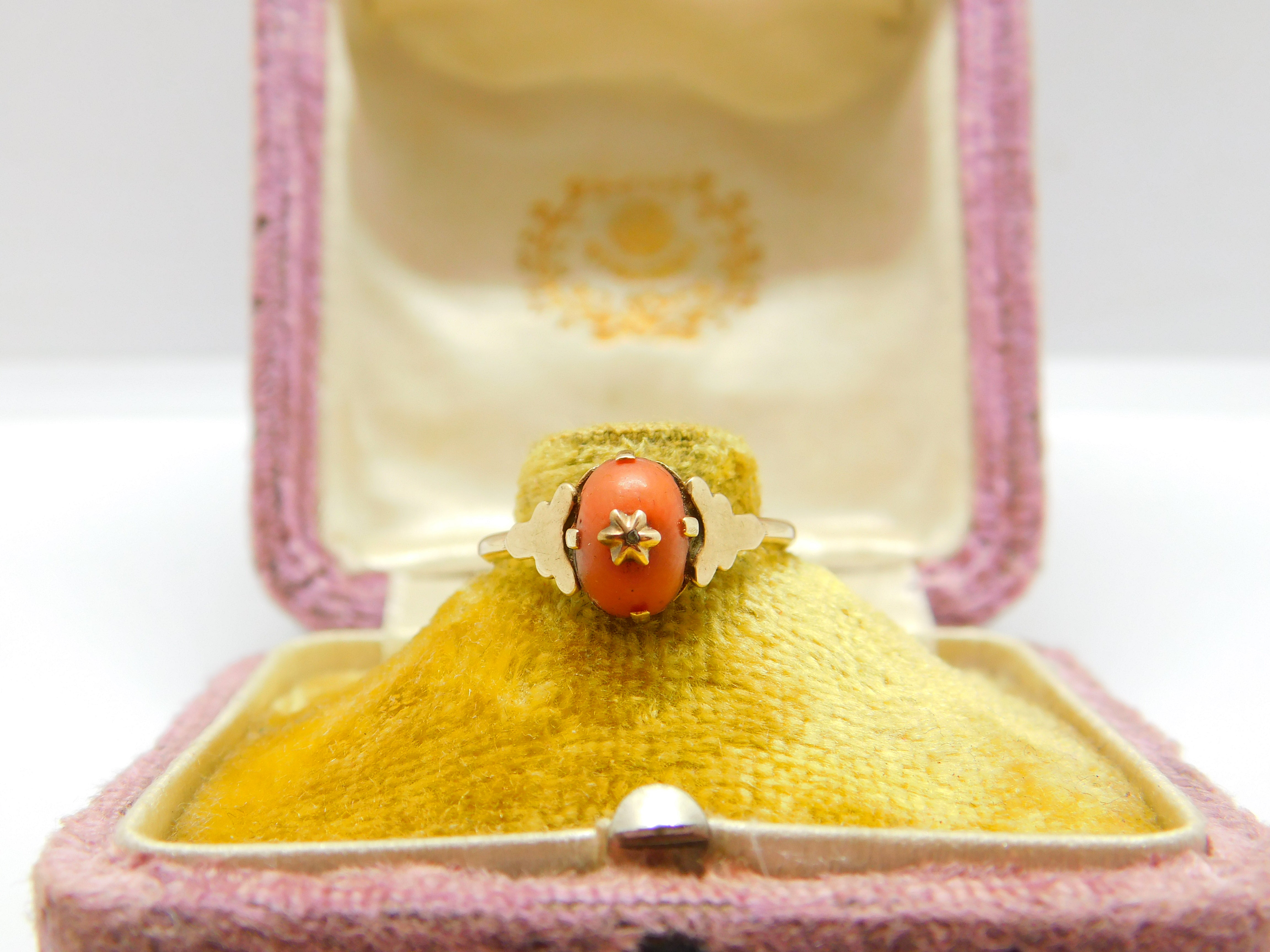 Edwardian 9ct Gold, Cabochon Coral & Diamond Band Ring Antique c1910