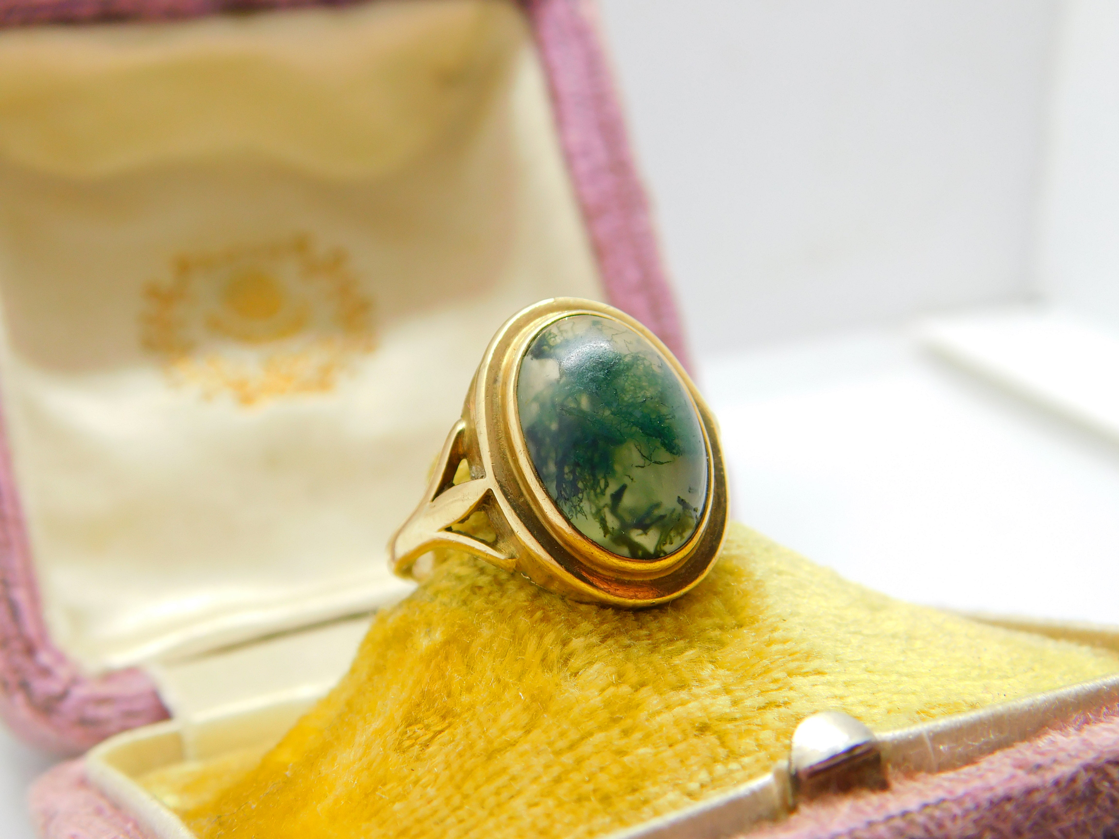 9ct Yellow Gold & Cabochon Moss Agate Signet Ring Vintage c1960 Size O UK