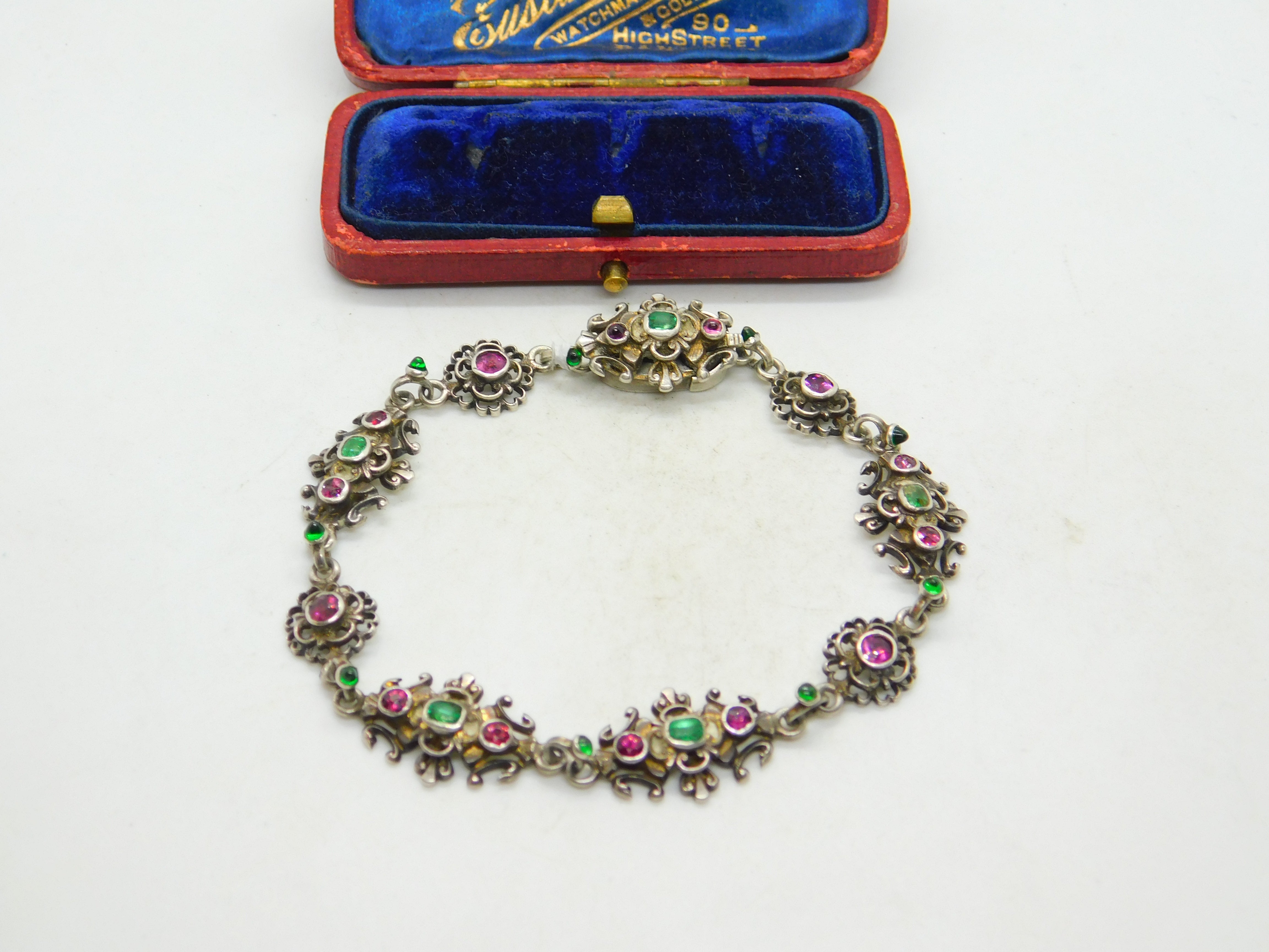 Austro Hungarian Emerald and Amethyst Paste Sterling Silver Bracelet Antique c1860