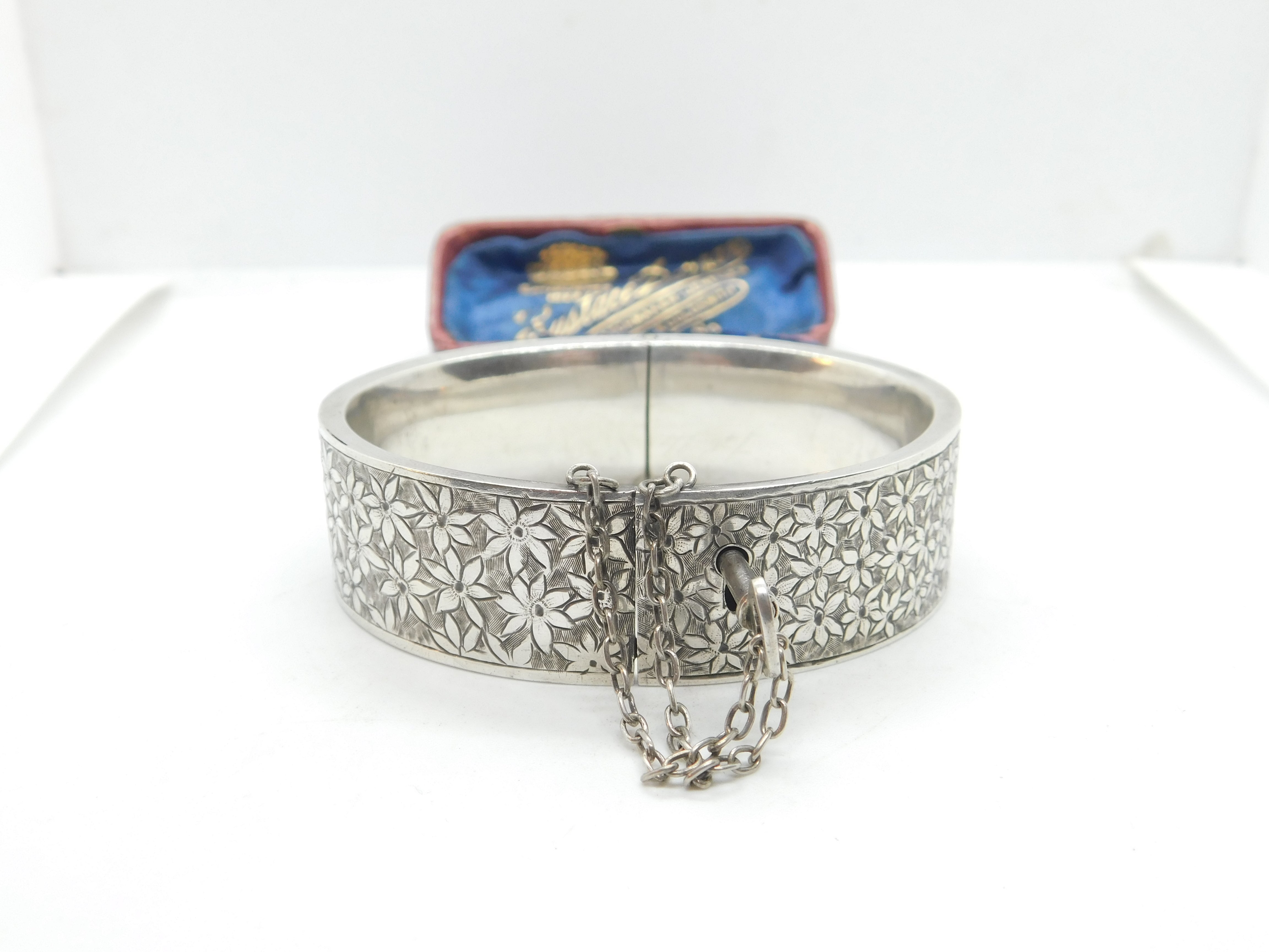 Aesthetic Movement Sterling Silver Floral Bangle With Lock & Key Victorian c1880