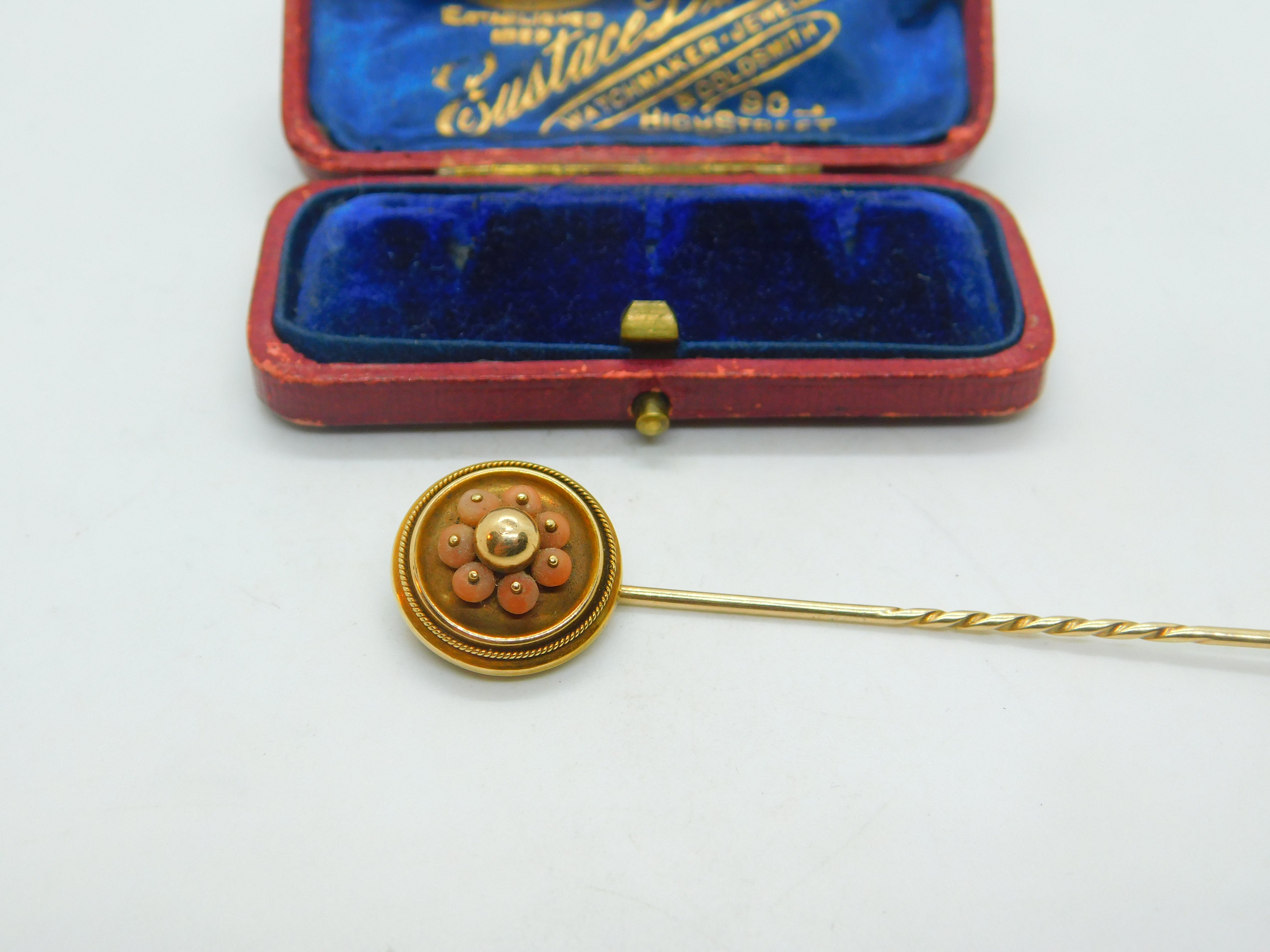 Victorian 18ct Yellow Gold & Coral Set Stick Pin Antique c1880 Etruscan Style