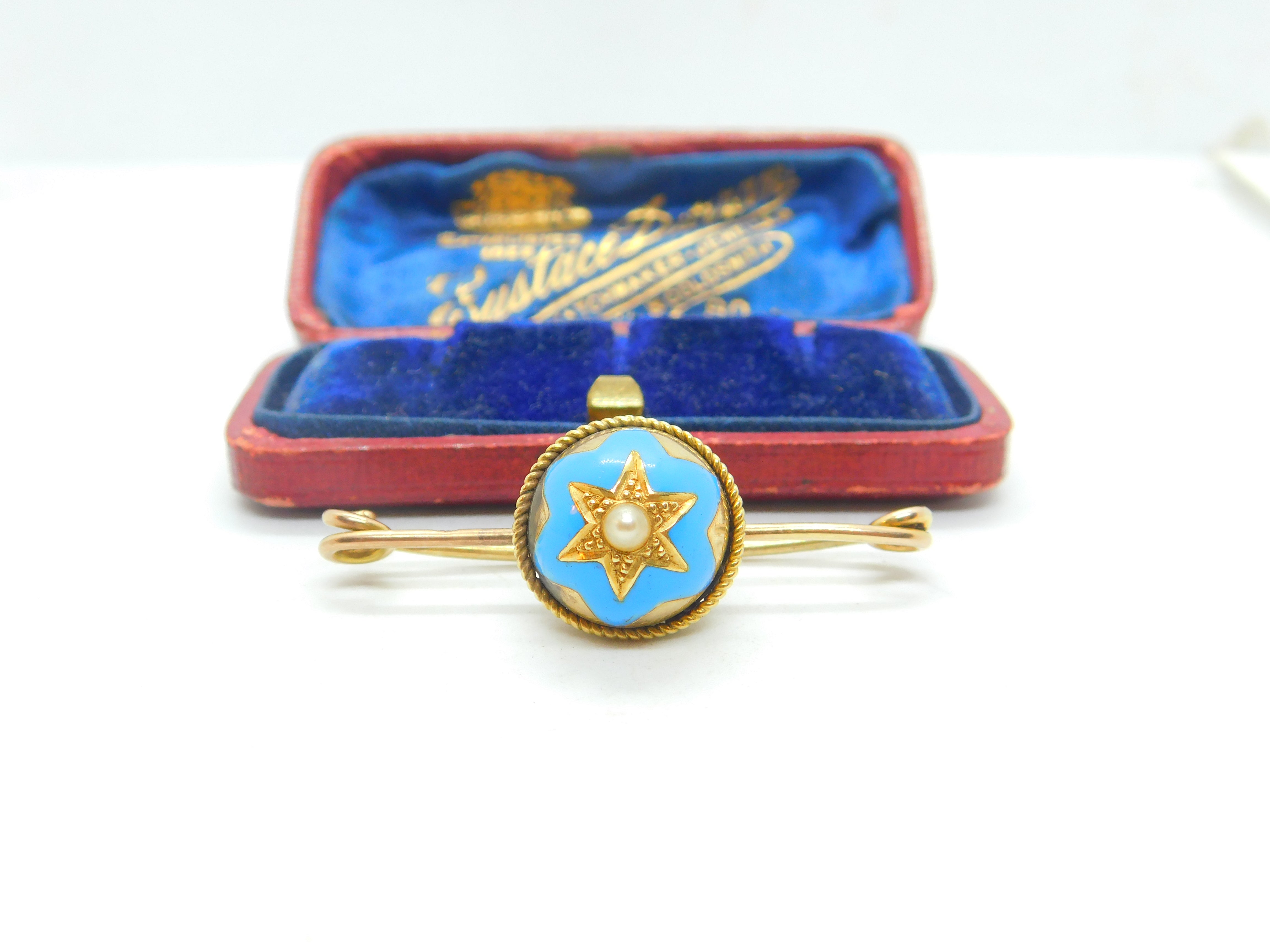 Victorian 18ct Gold, Turquoise Enamel & Seed Pearl Sweetheart Brooch Antique