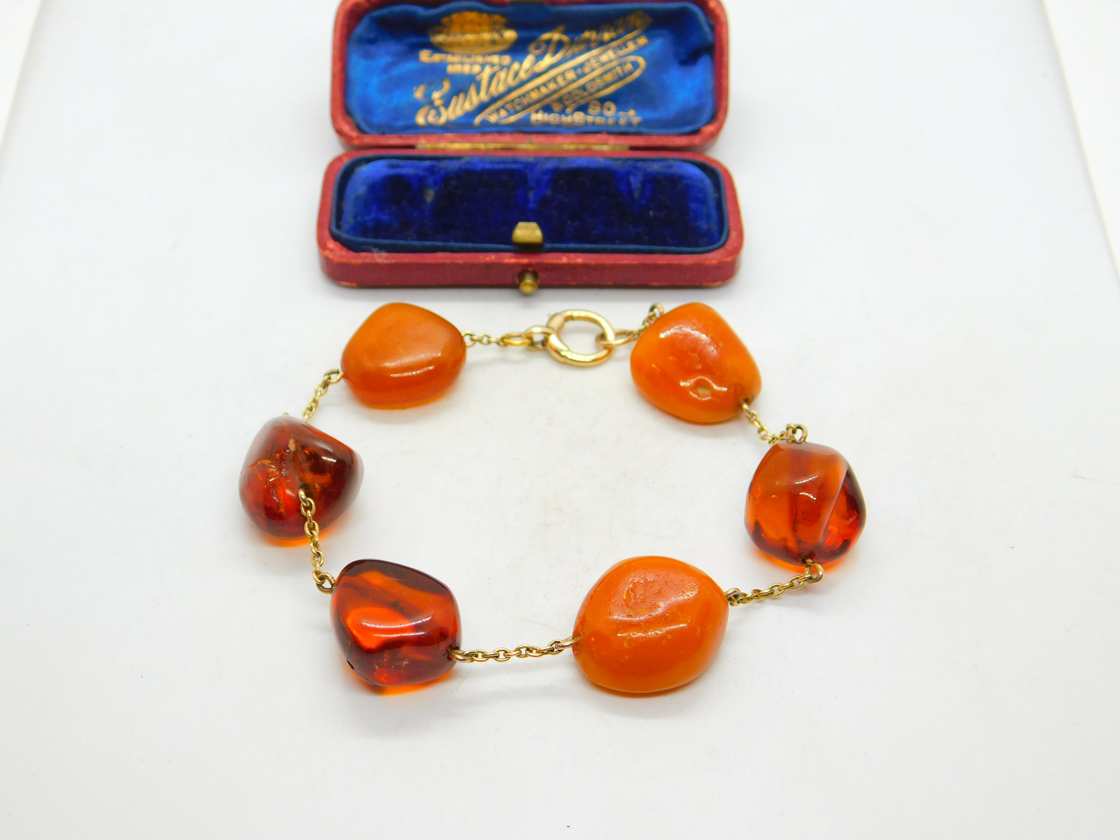9ct Yellow Gold & Baltic Amber Set Link Bracelet Vintage c1960 8.5" Length