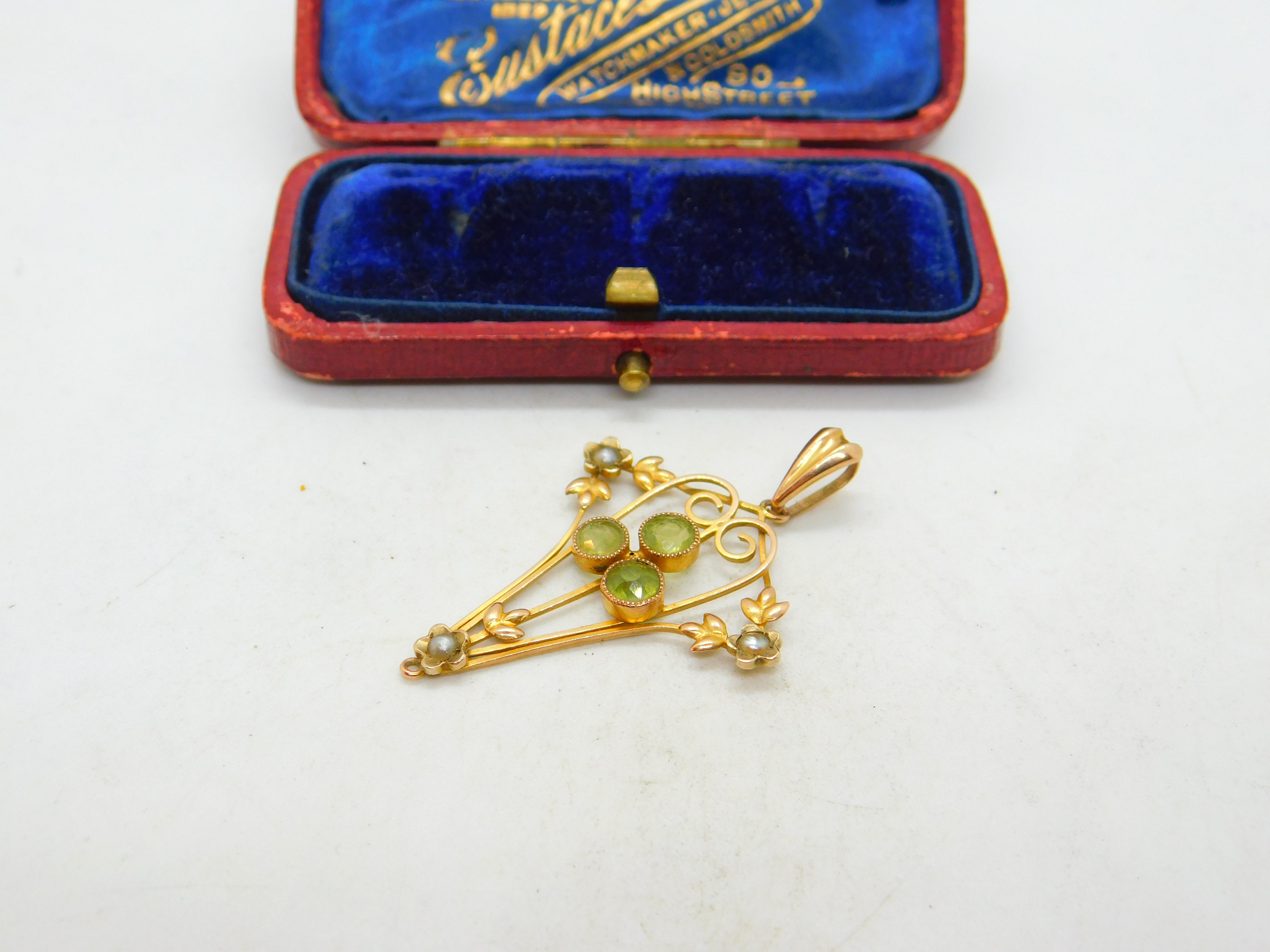 Edwardian 9ct Gold, Peridot & Seed Pearl Lavalier Pendant Antique c1910