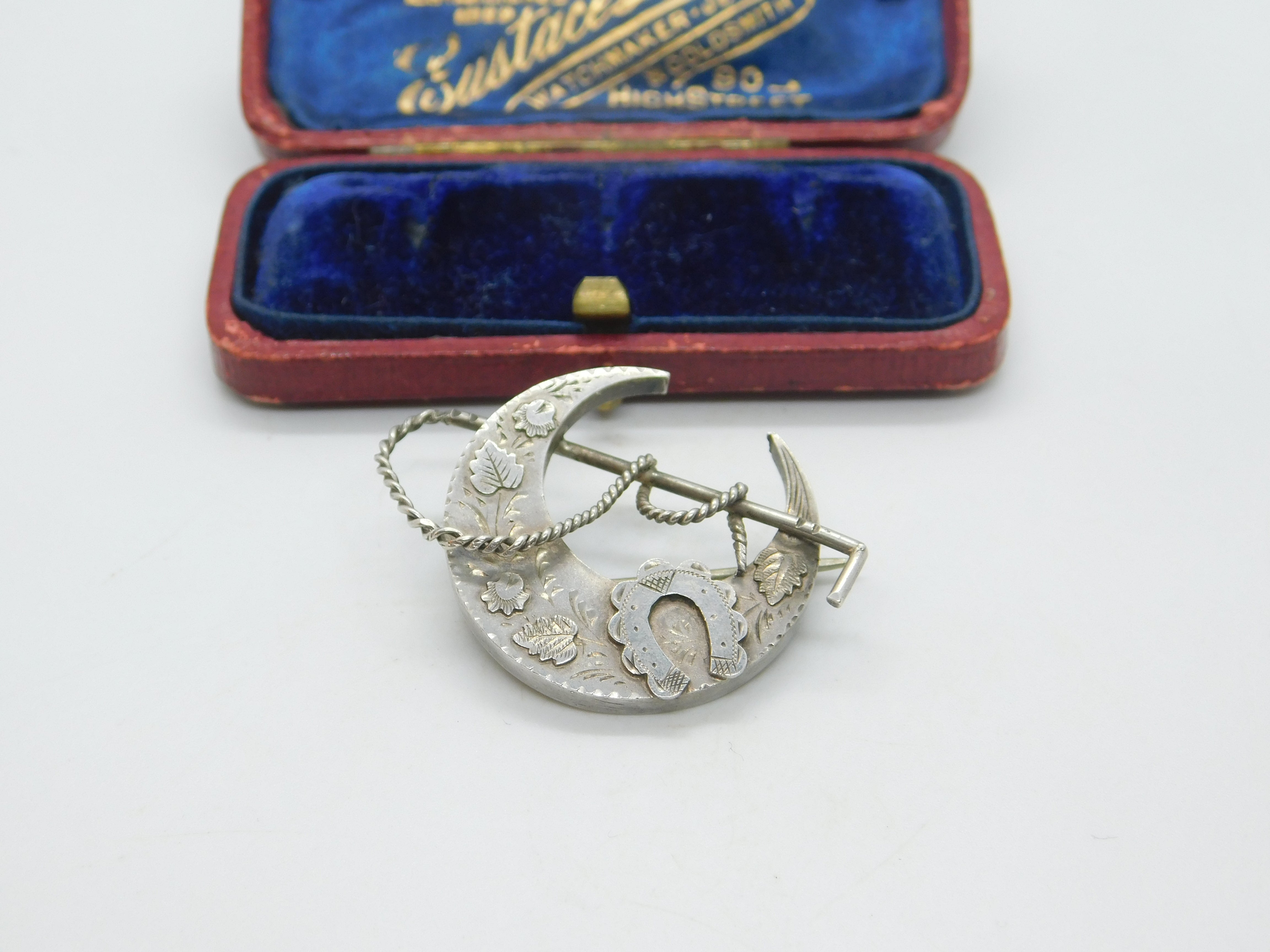 Victorian Sterling Silver Crescent, Crop & Horseshoe Sweetheart Brooch 1888 Chester