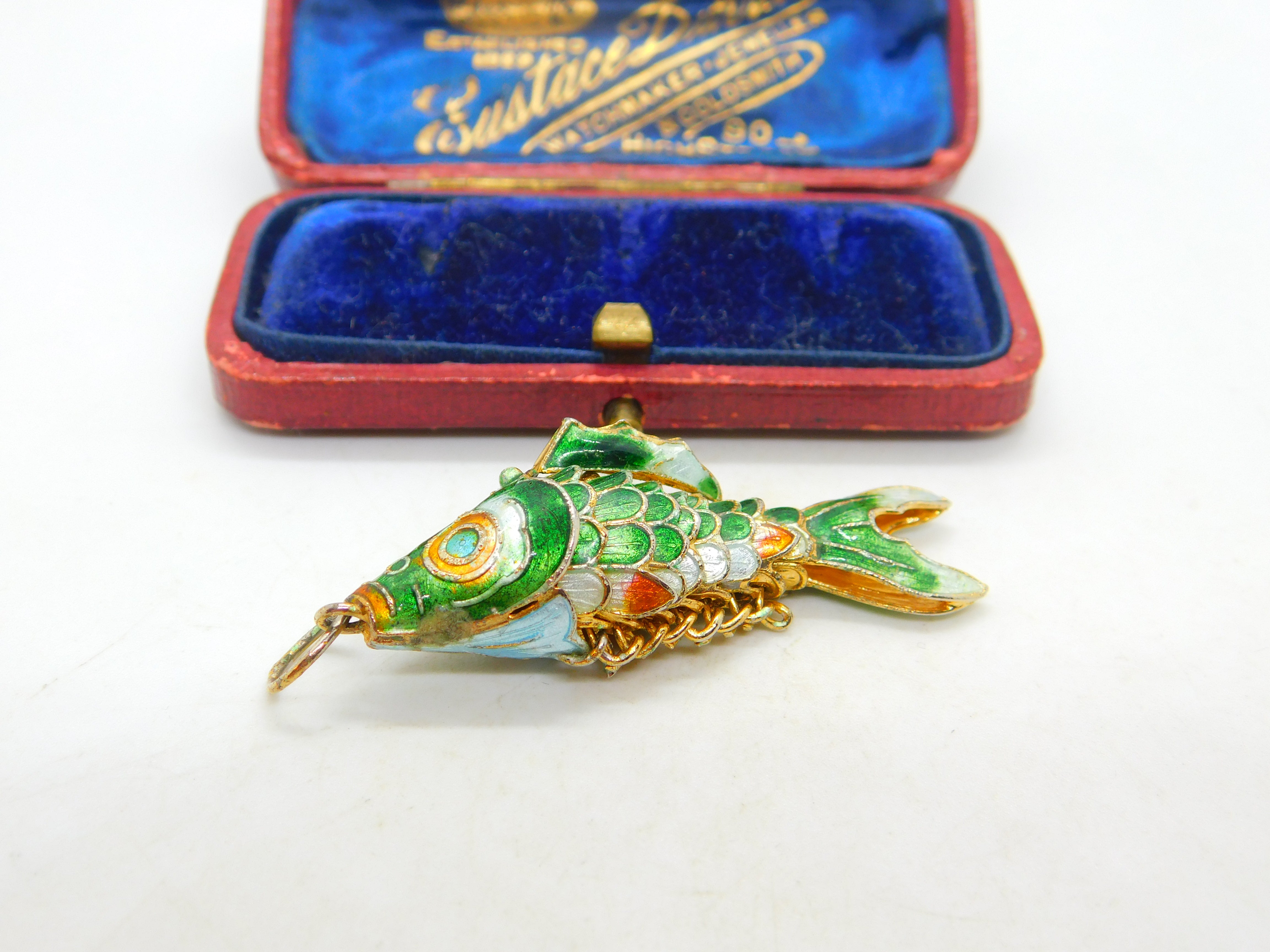 Chinese Export Sterling Silver Gilt & Enamel Flapping Fish Pendant Mid-Century