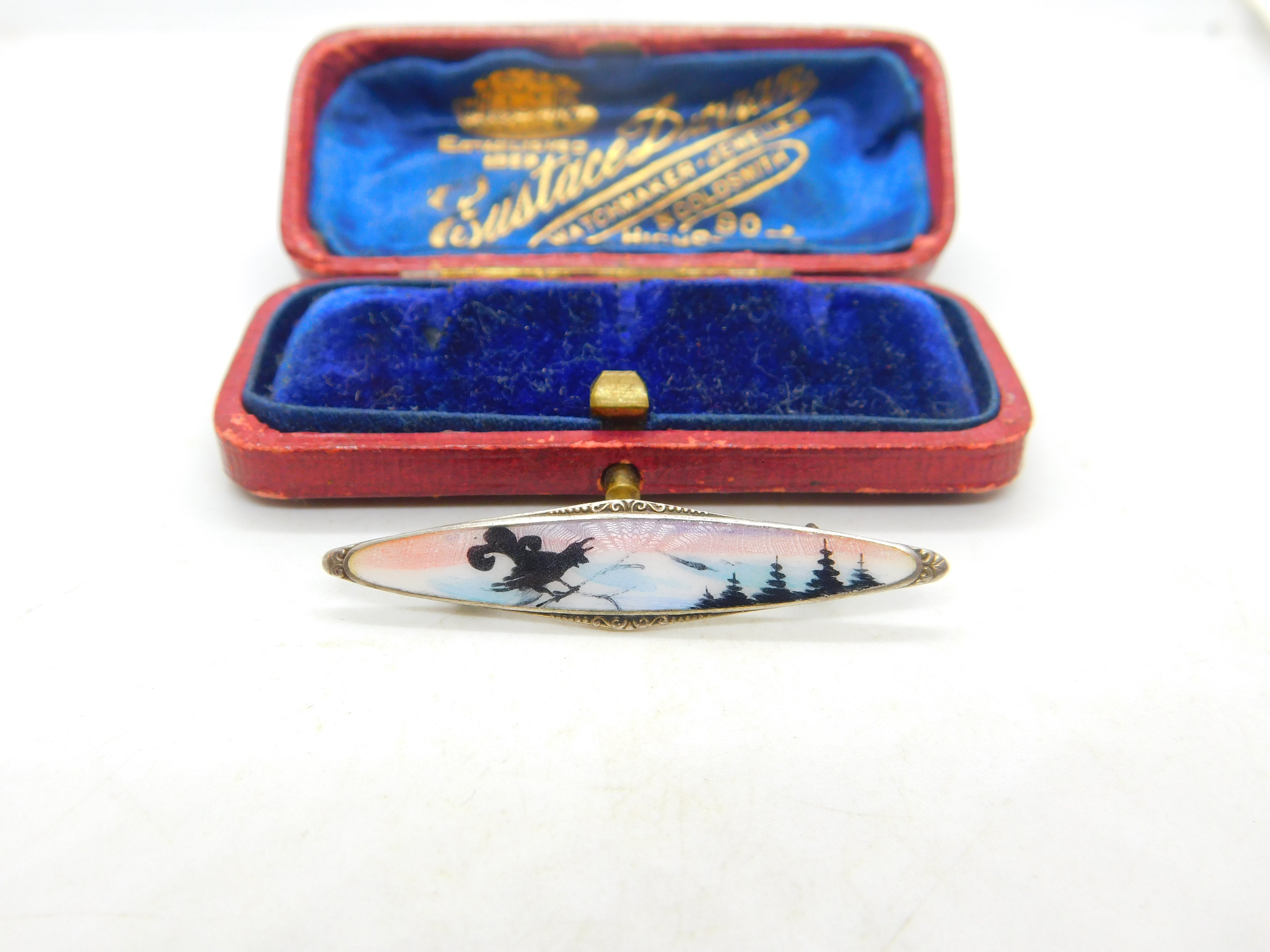 Norwegian Sterling Silver & Enamel Reindeer Scene Brooch Antique c1920 Art Deco