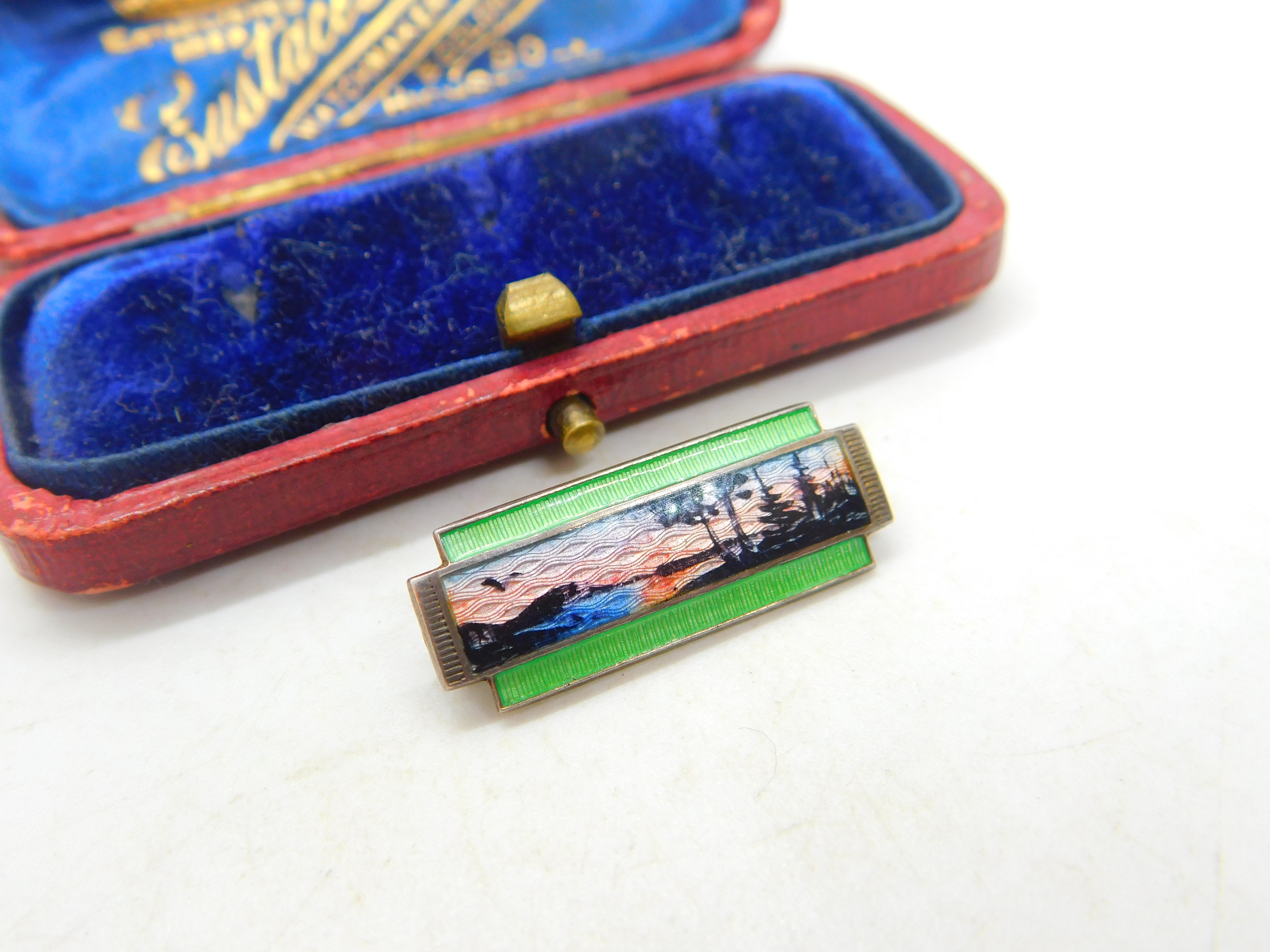 Marius Hammer Sterling Silver & Rare Green Enamel Winter Scene Brooch Antique