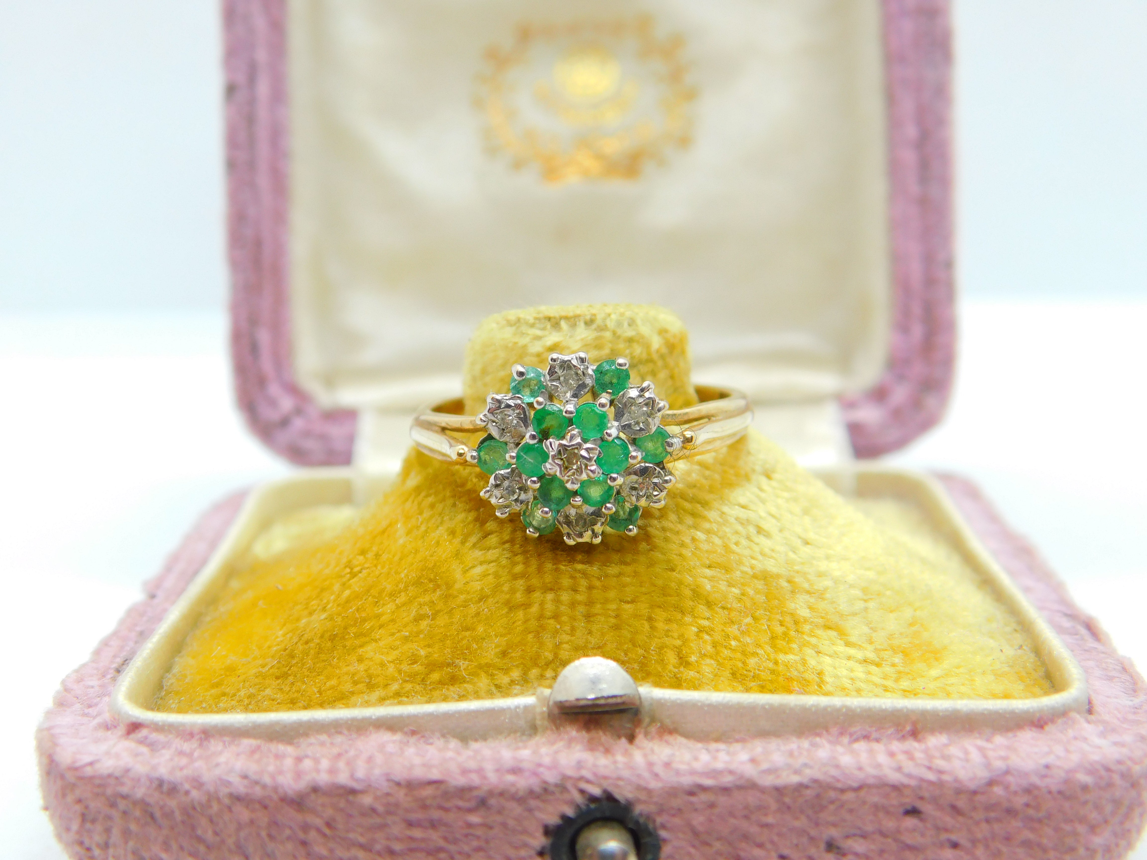 9ct Yellow Gold Emerald & Diamond Floral Cluster Ring Vintage c1980 Size R UK