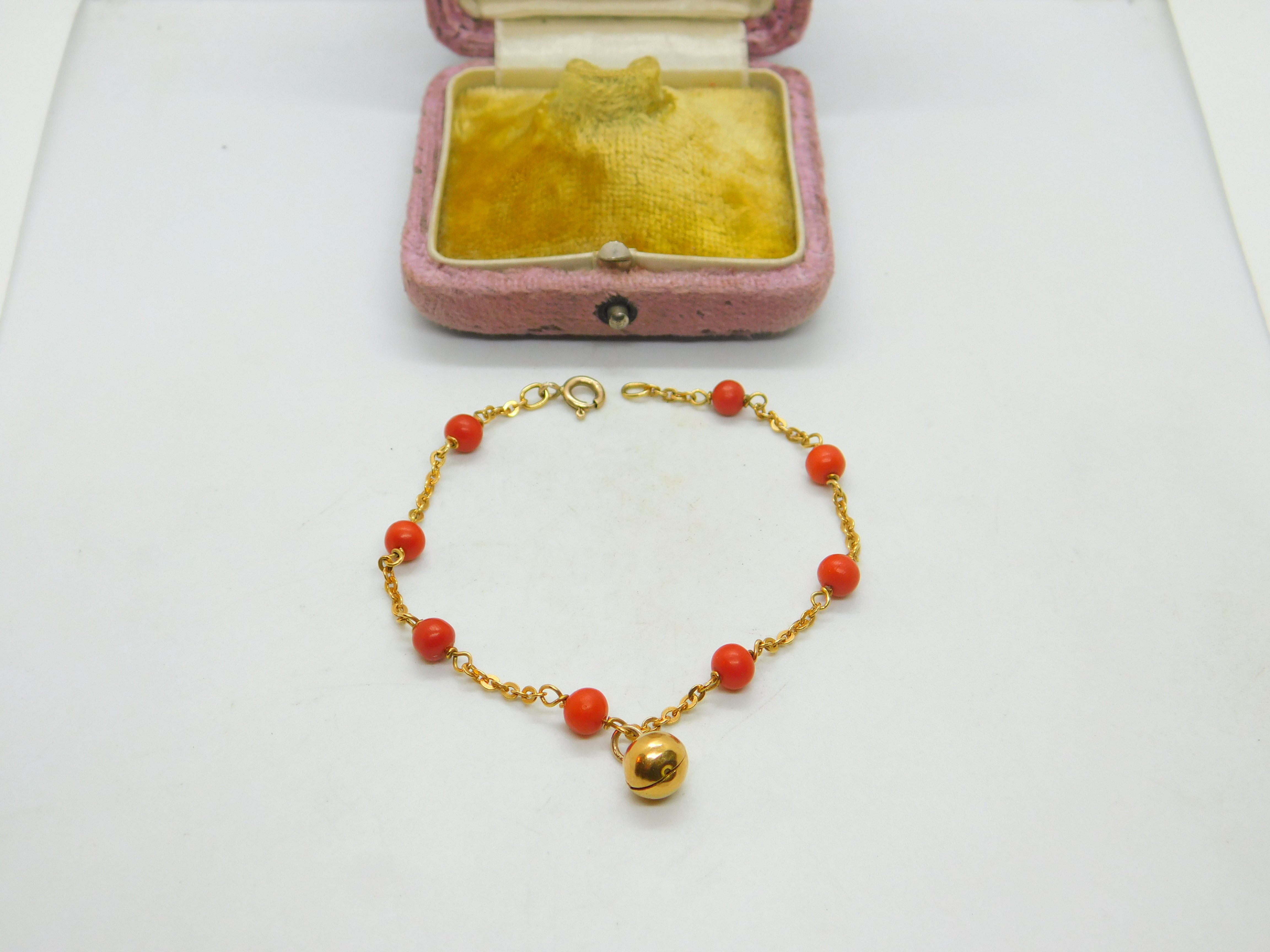 9ct Yellow Gold & Red Coral Bead Bracelet With Bell Charm Vintage c1960 7.5"