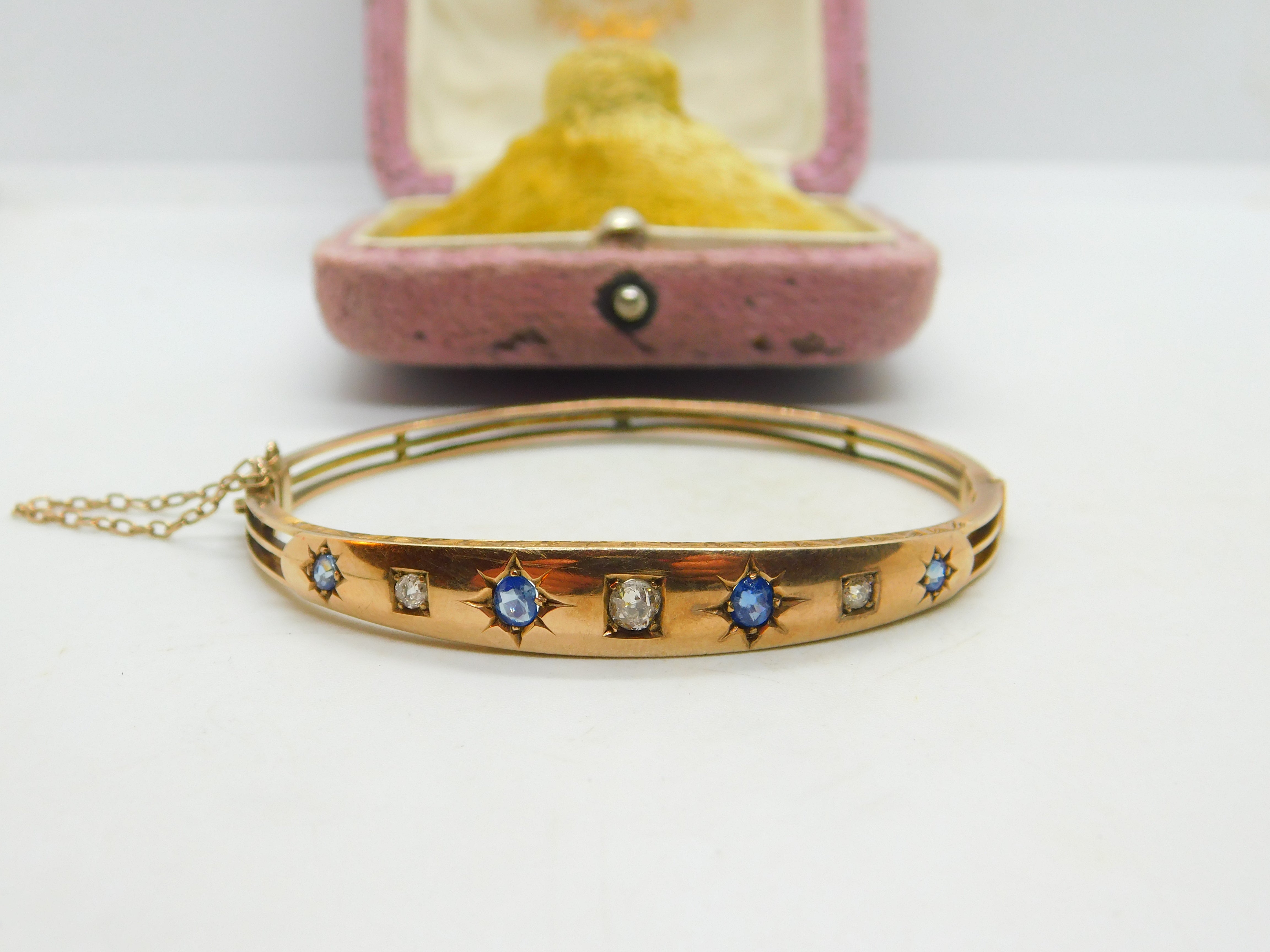 Victorian 9ct Gold, 0.4ct Diamond & Sapphire Bangle Bracelet Antique 1894