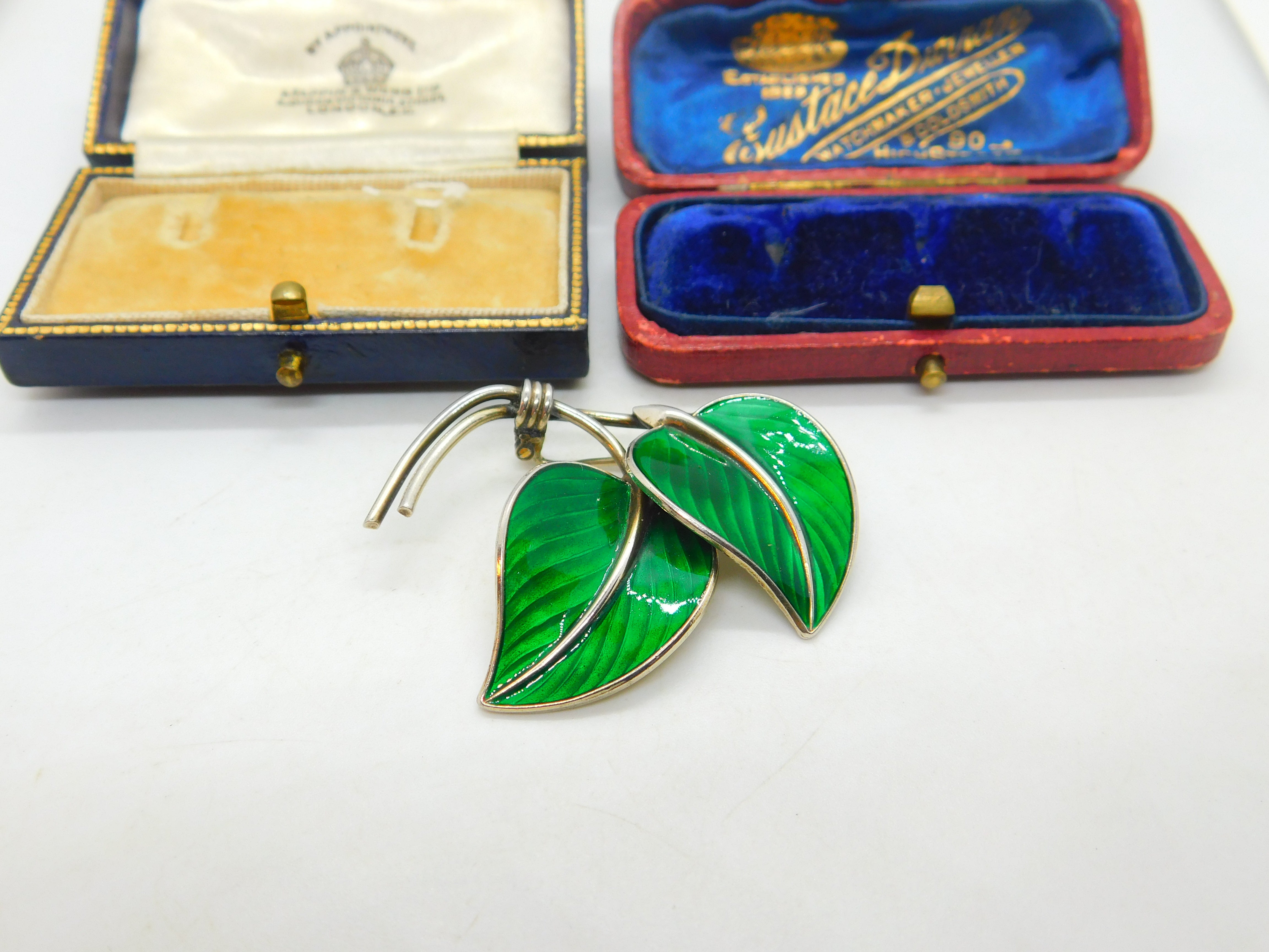 Hans Myhre Norway Sterling Silver Green Enamel Leaf Brooch Antique c1930 Deco