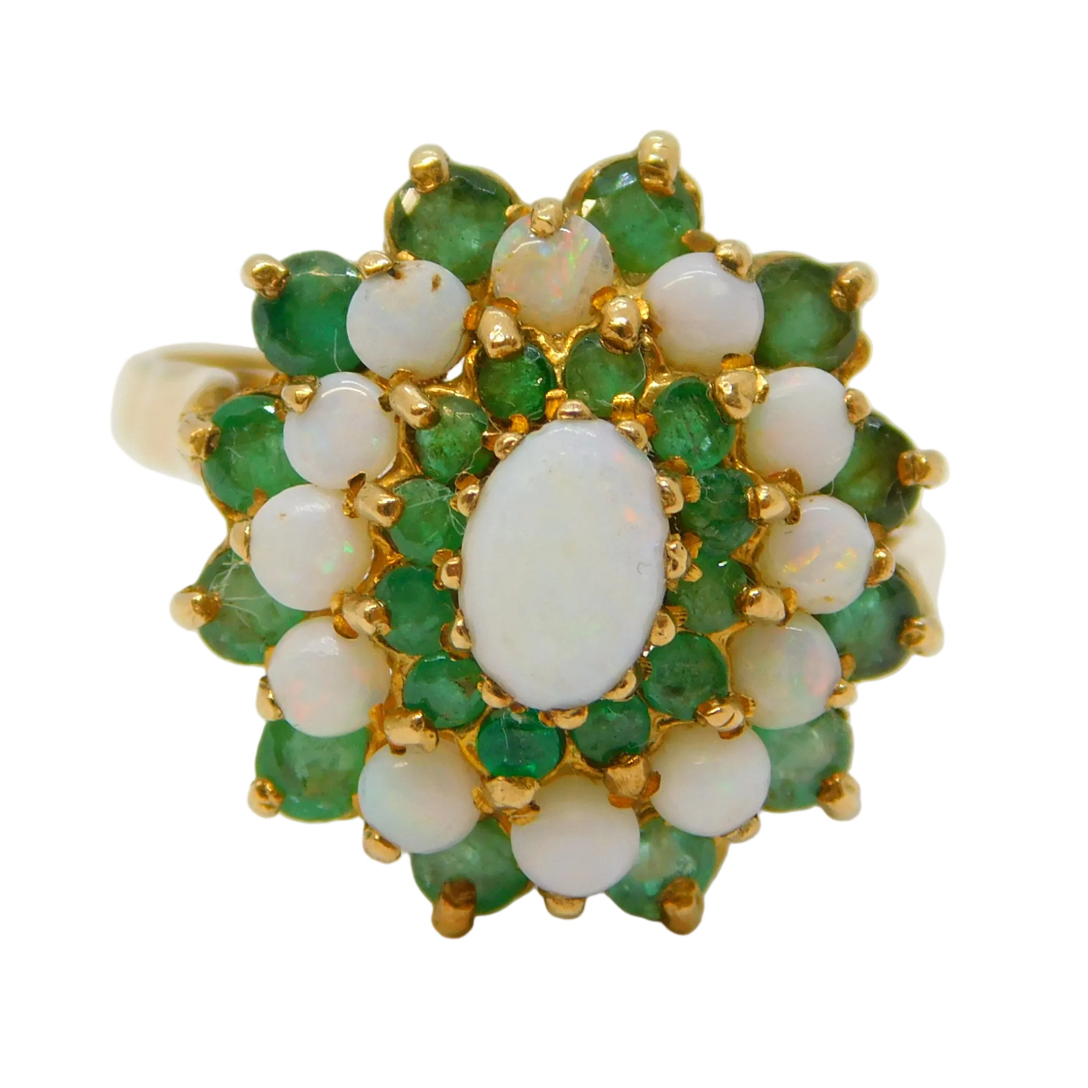 9ct Yellow Gold, Emerald & Opal Floral Cluster Ring Vintage 1977 London