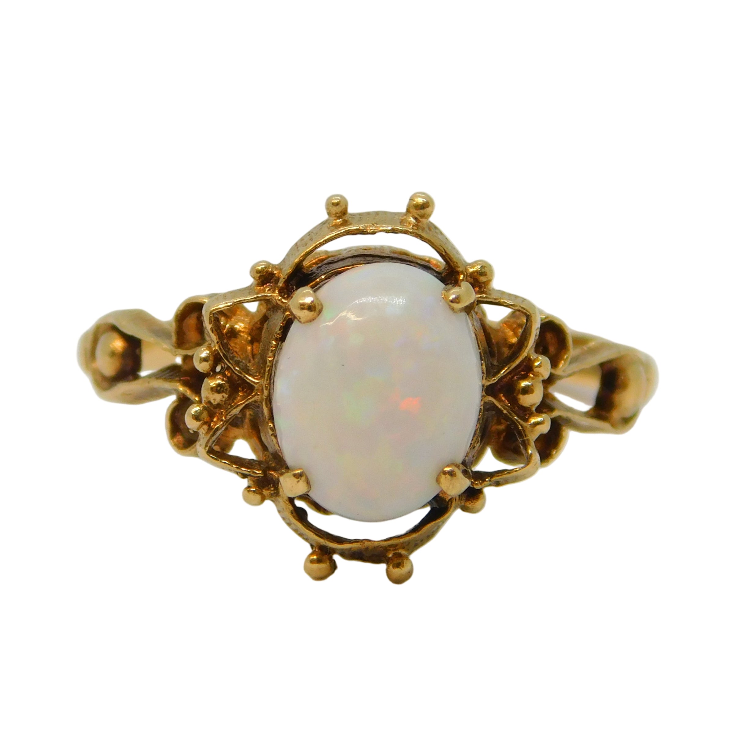 9ct Yellow Gold, Cabochon White Opal Set Floral Dress Ring Antique 1949 Deco