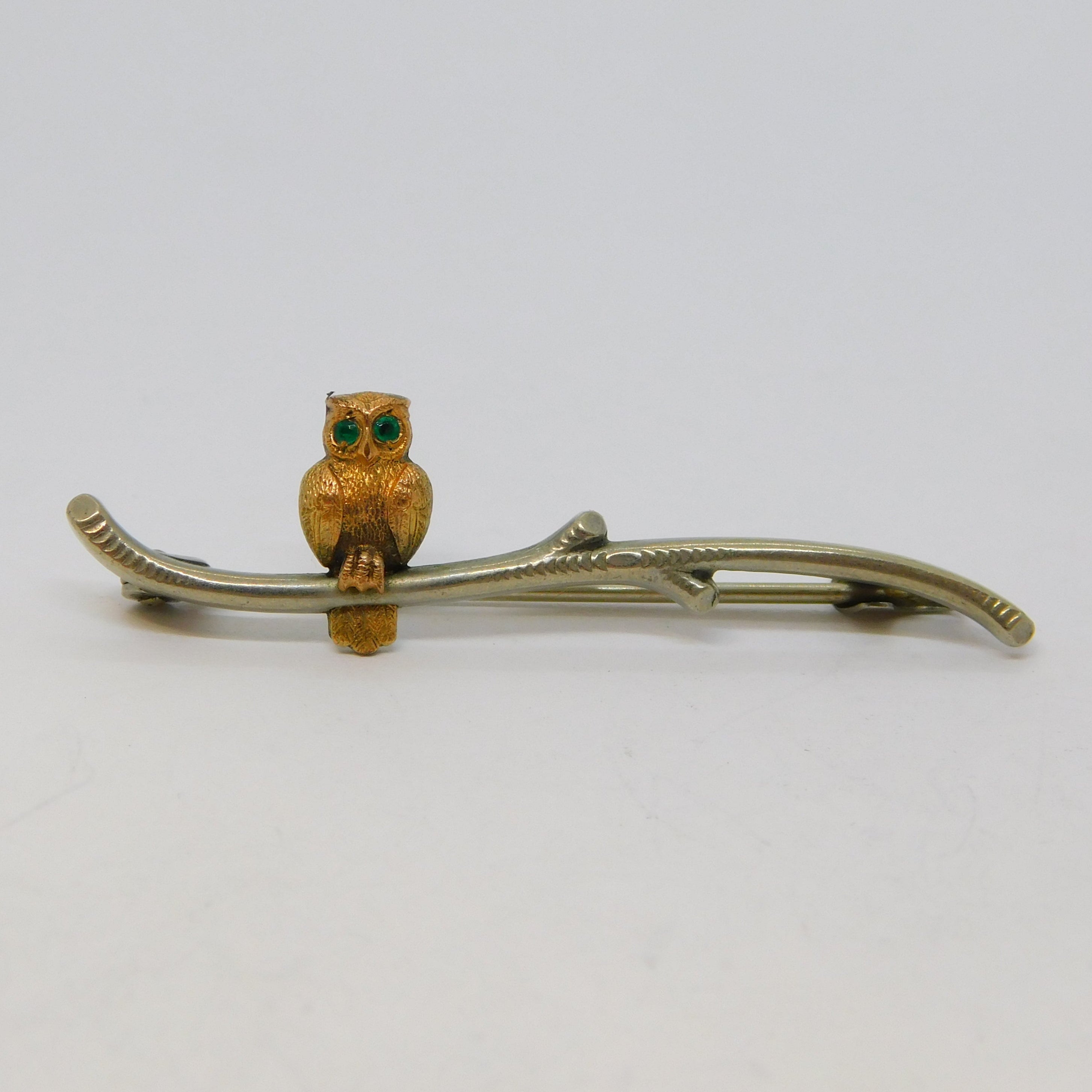 Edwardian 9ct Gold & Sterling Silver Perched Owl on Branch Brooch Antique c1910