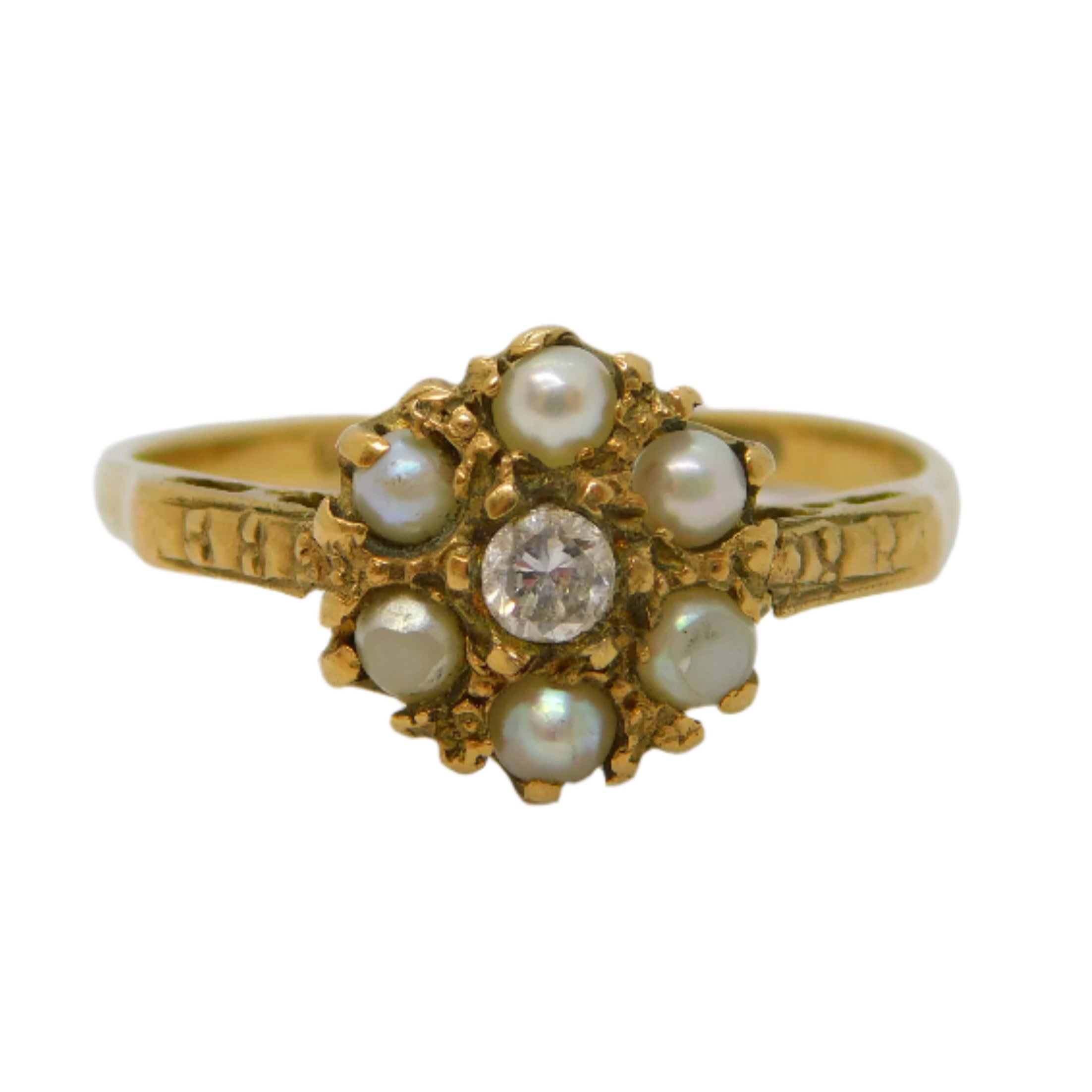 9ct Yellow Gold, Pearl, 0.1ct Diamond Floral Cluster Ring Antique c1920 Art Deco