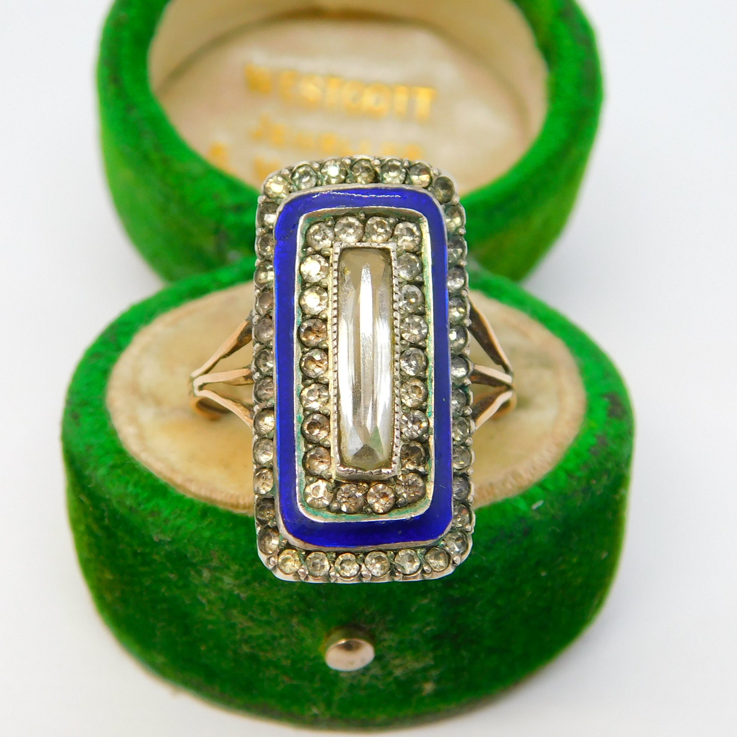 9ct Gold & Silver, Blue Enamel & Paste Set Cocktail Ring Antique c1920 Art Deco